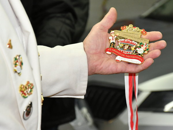 Gries dankte den Gastgebern der Räumlichkeiten ebenso wie den Fahrzeugspendern und gelobte eine pflegliche Behandlung der Karossen während der nun folgenden Wochen in der fünften Jahreszeit. „Die Gesellschaft weiß diese Unterstützung durch die hier Anwesenden, die es in dieser Form schon viele Jahre gibt, sehr zu schätzen“, erklärte er. Als Dankeschön wurde der Gesellschaftsorden verliehen, der in diesem Jahr das historische Bahnhofsgebäude zeigt. Desweiteren, in Anlehnung an die bekannte Peter und Paul-Kirmes früherer Jahre, ein Kettenkarussell. Mit einem kräftigen "Alaaf und Kall Du" wurde auf die neuen Ordensträger ausgerufen.