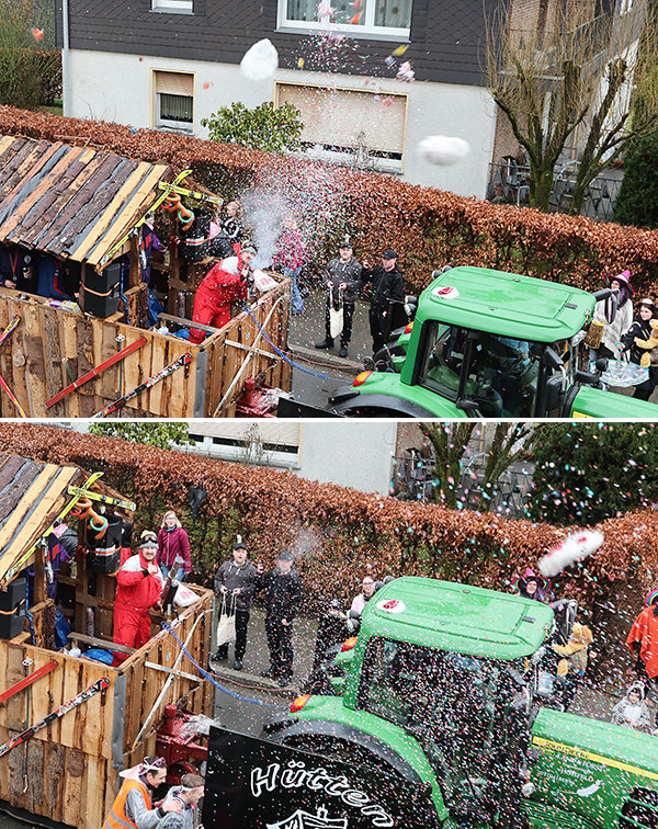 [Die Gruppe „Hüttenhausen“ verschoss ihr Kamelle von ihrem Wagen aus.]
