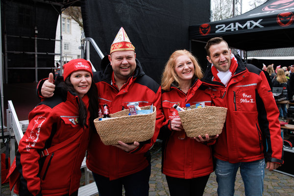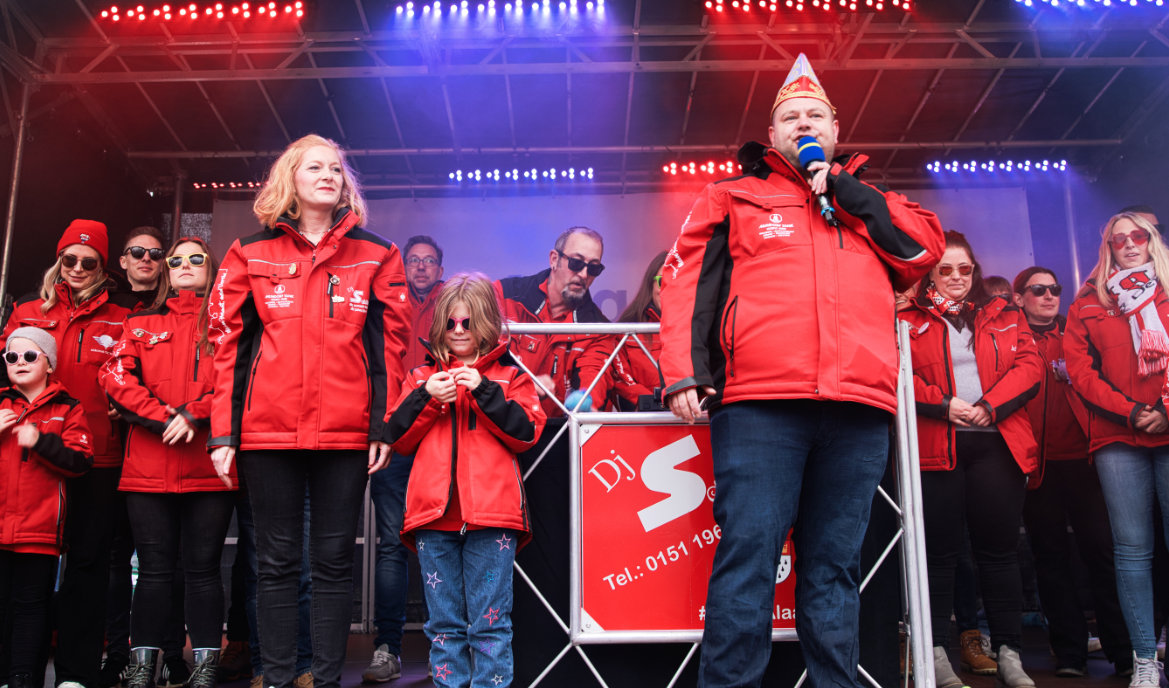 Mit der Garde „Pänz von der Burg“ legte die mittlere Tanzgruppe dann richtig los mit „Mir brenne lichterloh, es ist geschafft, der erste Tanz der Session“, hieß es aus der Gruppe, die seit kurzem auch einen neuen Hebefiguren-Trainer haben. Mit der Aufforderung „Pänz, stellt euch auf!“, zeigten zum Abschluss die Mädchen ihren „Mädchentanz“. Nach einer kleinen Verschnaufpause versammelte sich langsam auch das Gefolge des neuen Prinzenpaares vor der Bühne zum Höhepunkt des Tages. Sie alle warteten auf die Ankunft der Tollitäten.