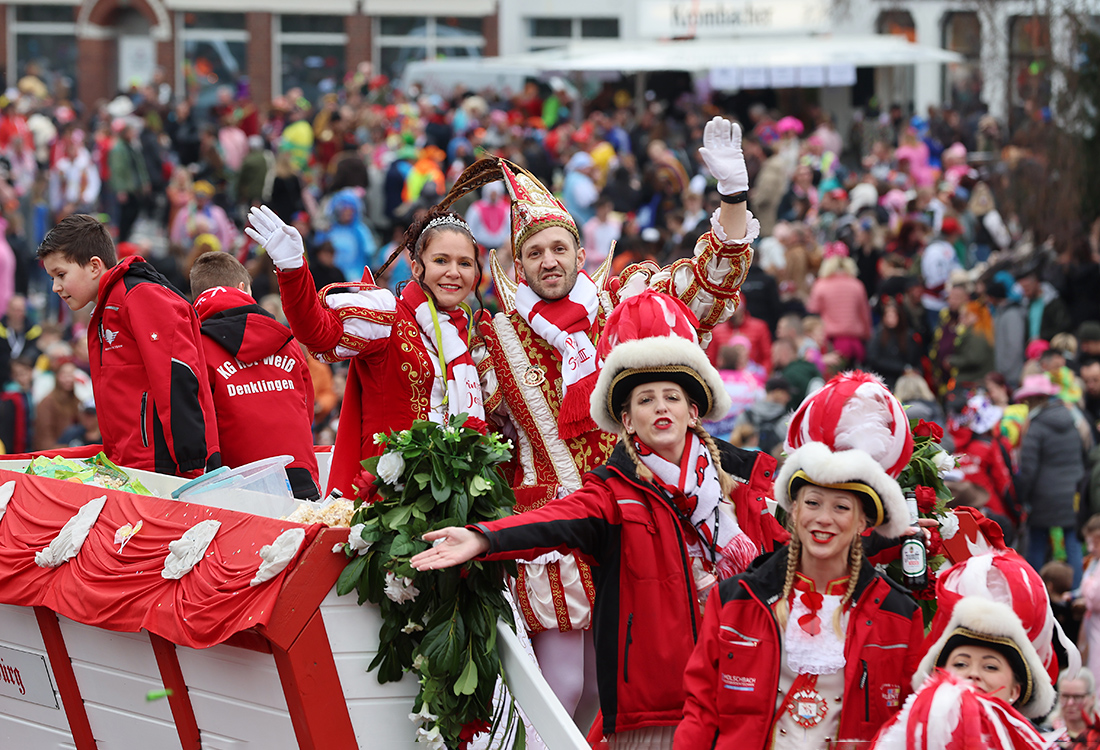 Reichshof - Den Höhepunkt „D'r Zoch kütt“ zelebrierte die KG Rot-Weiß Denklingen zusammen mit einer riesigen Menge Narrenvolks entlang des Zugweges.