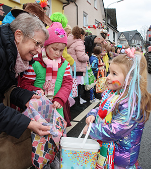 Auf die zündende Idee von Familie Schönlein aus Odenspiel wurde vor 15 Jahren die „KG Ospel Jung und Alt“ aus der Taufe gehoben, deren Teilnahme am Umzug seitdem Ehrensache ist. Das überwältigende rot-weiße Finale der Karnevalsparade bildeten wie immer die Prunkwagen des Elferrates, mit Präsident Hansi Welter und der Senatswagen unter Regie von Ralf Langhein, während das Prinzenpaar Stefan III. und Jessica vom Prinzenwagen Bützcher und Kamelle auf ihre Untertanen hinabregnen ließen.