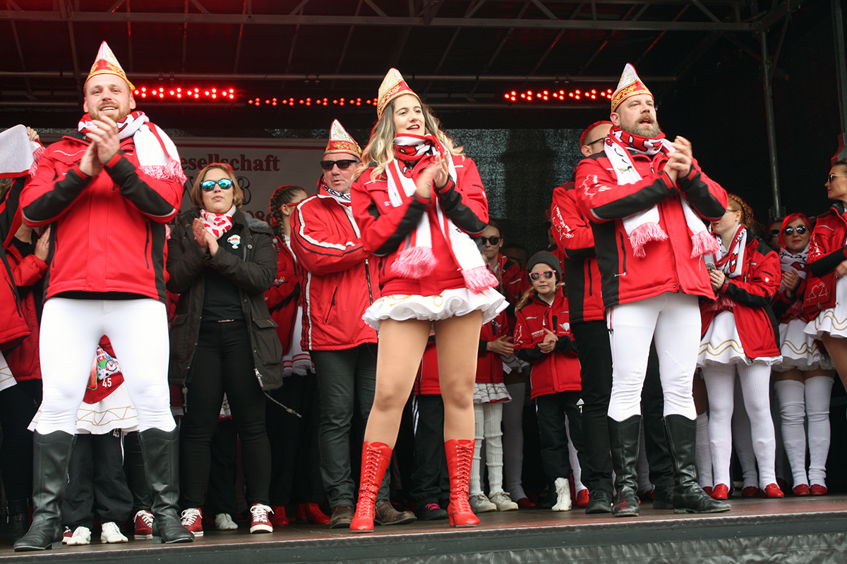 "Die Burgmäuse" machten mit "Null oder hundert" und den "Mäusen de Luxe" die herzerwärmenden Eisbrecher, sodass "die Pänz von der Burg" ein gut aufgelegtes Publikum übernahmen. Die Burggarde brachte anschließend nicht nur die Bühne zum Beben, sondern ermöglichte dem designierten Trifolium einen letzten Inkognito-Auftritt. Mit Stolz in der Stimme lüftete Präsident Welter dann das Geheimnis um die neuen Majestäten, die gleichzeitig Tänzer der Burggarde sind und so in der kommenden Session in Doppelfunktion tätig sein werden.