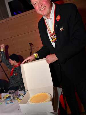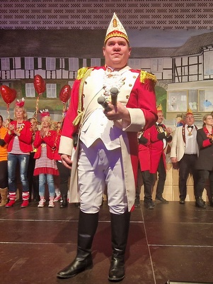 Bützchenverteilend und strüsjerwerfend bahnten sich Prinz Christoph III. aus dem Hause Wallefeld mit seiner Prinzessin Conny und großem Gefolge aus Reihen des RKV ihren Weg zur Bühne. Bürgermeister Dr. Gero Karthaus wusste schmunzelnd in seiner Antrittsrede viel Privates über das Paar zu berichten. Der Prinz sei allein schon deshalb prädestiniert für das Amt, weil dessen Nachname dem einer Ortschaft in der Gemeinde gleiche. Er arbeite in einer Rasenmäherschmiede in der Nachbarkommune und die Prinzessin sei gelernte Konditorin. Zu der Überraschung des Bürgermeisters bekam er spontan eine scherzhaft geforderte Eierlikörtorte nach der Übergabe der Insignien überreicht.