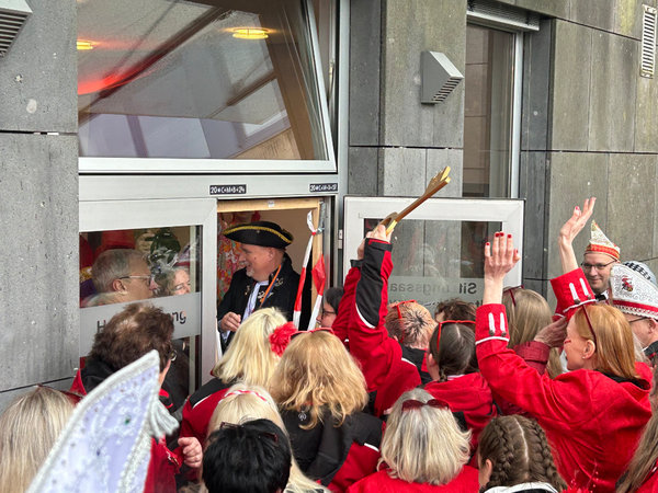 Ein letztes Mal musste sich Lindlars Bürgermeister Dr. Georg Ludwig den Karnevalisten beim heutigen Rathaussturm geschlagen geben, denn er wird im September nicht mehr für sein Amt kandidieren. Pünktlich um 11:11 Uhr rissen die Jecken von der KG Rot-Weiß Lindlar das Flatterband von der Eingangstür. Es dauerte nicht lange, bis Sandra Pajak und Manuela Exel den heiß umworbenen goldenen Schlüssel in den Händen hielten. „Wir haben alles gegeben“, sagten die beiden lachend.