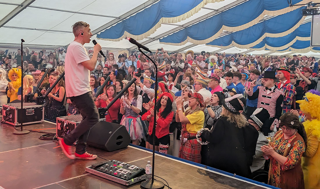 Besonders freuten sich die KG-Mitglieder und natürlich auch das närrische Publikum, dass die Kölner Superstars von Kasalla an einem der betriebsamsten Karnevalstage des Jahres ihren Weg in die Republik gefunden hatten. Die Morsbacher gaben sich äußerst textsicher und rückten ganz nah an die Bühne heran. Kasalla brachten das Zelt zum Kochen und zum ersten Mal standen alle, gerne auch auf den Bänken. Ohne Zugabe durften die Jungs das „Dorf mit M“ nicht verlassen, machte Mauelshagen „gleichsam nett und bedrohlich“ deutlich, wie Sänger Bastian Campmann amüsiert konstatierte.
