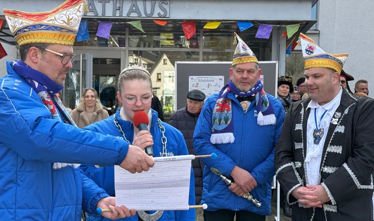 Pünktlich um 11:11 Uhr begrüßte Mosbachs Bürgermeister Jan Schumacher die zahlreich erschienenen Gäste auf dem Rathausvorplatz, um sogleich zu verkünden, dass er nicht vorhabe, nach nur dreieinhalb Monaten sein frisch erworbenes Amt wieder abzugeben. Mit der Unterstützung seines Rathausteams, wolle er es Prinzessin Liya I. und ihrem Vater und Begleiter Jörg Bukowski, seinem Amtsvorgänger, nicht so leicht machen an den Schlüssel zu gelangen. Getreu den im Motto von Liya I. genannten Vorlieben: „Karneval, Reiten und Feuerwehr“ habe man einen anspruchsvollen Parcours für beide aufgebaut. Mit großer Freude kündige er nunmehr das allererste Hobby-Horsing-Turnier in Morsbach an. Dabei gelte es insbesondere die Reihenfolge der absolvierten Aufgaben zu beachten.