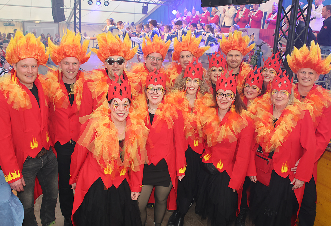 Zwischen den Zauberern, Elfen, Clowns oder Wikingern stach die Gruppe „Kappesjesichter“ als wandelnde Flammen besonders hervor. Fünf Stunden sitzt man an so einem Kostüm, erzählt Annika Baldus. Das zeigt schon: Die rund 20 Morsbacher brennen so richtig für den Karneval und lassen sich seit 22 Jahren immer was Neues einfallen. Sie werden auch beim Rosenmontagszug mit einem Wagen dabei sein. Dann läuft auch schon ihr Nachwuchs mit. Die Karnevalskultur in Morsbach muss sich also keine Sorgen machen.