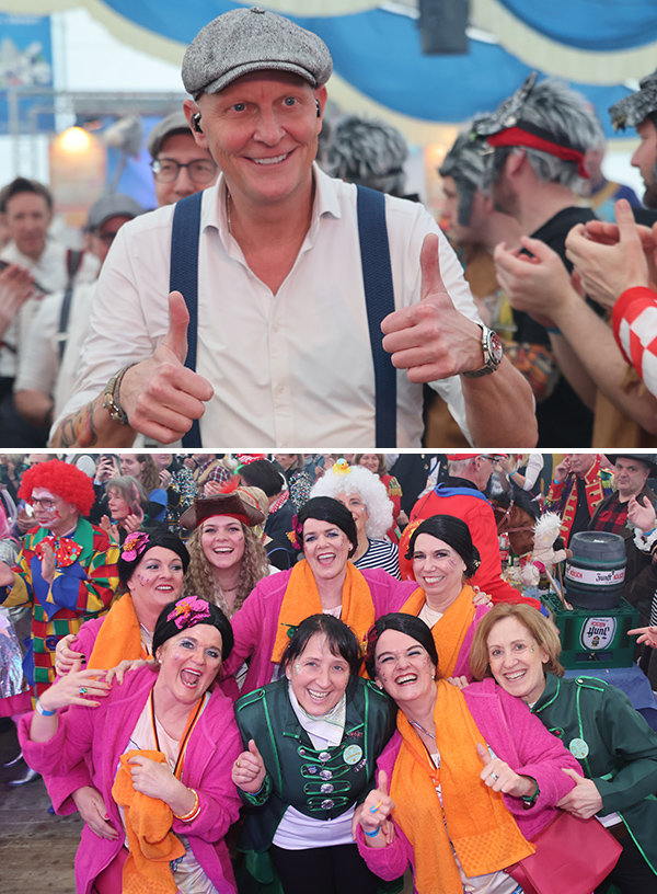 Natürlich wurde auch gesungen und dazu getanzt. Die Messlatte hoch hingen Klüngelköpp (Foto unten), seit mehr als 20 Jahren eine Institution im Kölner Karneval und natürlich auch im Oberbergischen. Ihr Hitfeuerwerk aus unter anderem „Niemols ohne Alaaf“, „1.000 Nächte“ oder „Jedäuf met 4711“ ließ das Festzelt erbeben. Und mit einer Trommeleinlage gab es von Klüngelköpp schonmal einen Vorgeschmack auf die Drummerholics, die später am Abend nach Auftritten von Torben Klein, den Swinging Funfares und Bel Kantholz, der Karnevalsband aus den Reihen der Eintrachtjugend Morsbach, das Finale mit Prinz Patrick I. und seinem Gefolge einleiteten. Dort begeisterte die Funkengarde ebenso wie die Garde Blau-Weiß, die sich selbst und noch einmal das Publikum zu Höchstleistungen antrieben.