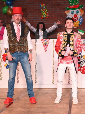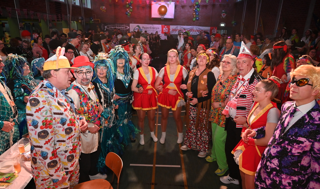 Und von den auftretenden Künstlern gibt es regelmäßig Lob für die große Bühne, deren Holzboden gerade vielen Tanzgruppen entgegenkommt. Ein fünfstündiges Nonstop-Programm, das Till Zenses (Foto, rechts) und Bernd Vorländer präsentierten, ließ kaum Wünsche offen, und viele Tanzgruppen verwöhnten die Gäste mit tollen Kostümen und gewagten Hebe- und Flugfiguren bis unters Hallendach. Begeistern konnten die Dürscheder Mellsäck und das Tanzcorps Blau-Weiß Vilkerath, aber auch Aggerperlen, Sparkly Dancers, Les Dancers und das Jugendtanzcorps aus Vilkerath wussten zu überzeugen. Aus Windeck waren die „Staatsen Kääls“ angereist und sorgten für prächtige Stimmung in der Halle.