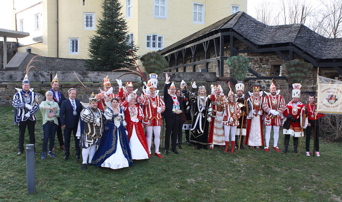 Anlässlich des traditionellen Tollitätenempfangs des Oberbergischen Kreises haben sich heute ab 16:11 Uhr die jecke High Society samt ihrer närrsichen Entourage in der Neuen Orangerie auf Schloss Homburg versammelt. In seiner Begrüßung dankte Landrat Jochen Hagt den Vertretern der 16 regionalen Karnevalsvereine für ihr Kommen und für das Wagnis, die erste Session nach der Corona-Pause wieder wie gewohnt vollumfänglich zu organisieren und zu feiern. "Es geht wigger", brachte er seine Hoffnung zum Ausdruck, dass ab sofort ausschließlich der Karnevalsbazillus grassiere.