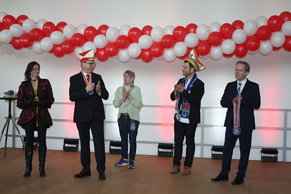 Mit einem extra vom Kreishausteam kreierten "Orden des Landrats", der einen Clown, die Geburtstagstorte zum Jubiläum des Treffens und das Wappen des Kreises zeigt, bedankte sich der Gastgeber zusammen mit seinen Stellvertretern Tobias Schneider und Margit Ahus sowie Kreisdirektor Klaus Grootens bei den oberbergischen Botschaftern des rheinischen Frohsinns.