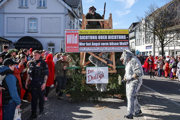 Erklärte die Hueschosser Jongen Partei (HJP) den ab und zu ein Schaf reißenden Wolf an Karneval noch zum braven Feiertier, ging es mit den „Dullys“ in die Märchenwelt. Dort jagte der große böse Wolf, angelockt von einigen echten(!) Rinderrippen, gleich mehrere Rotkäppchen und verschleppte sie in den Wald. An Ideenreichtum mangelte es den Morsbachern definitiv auch in diesem Jahr nicht.