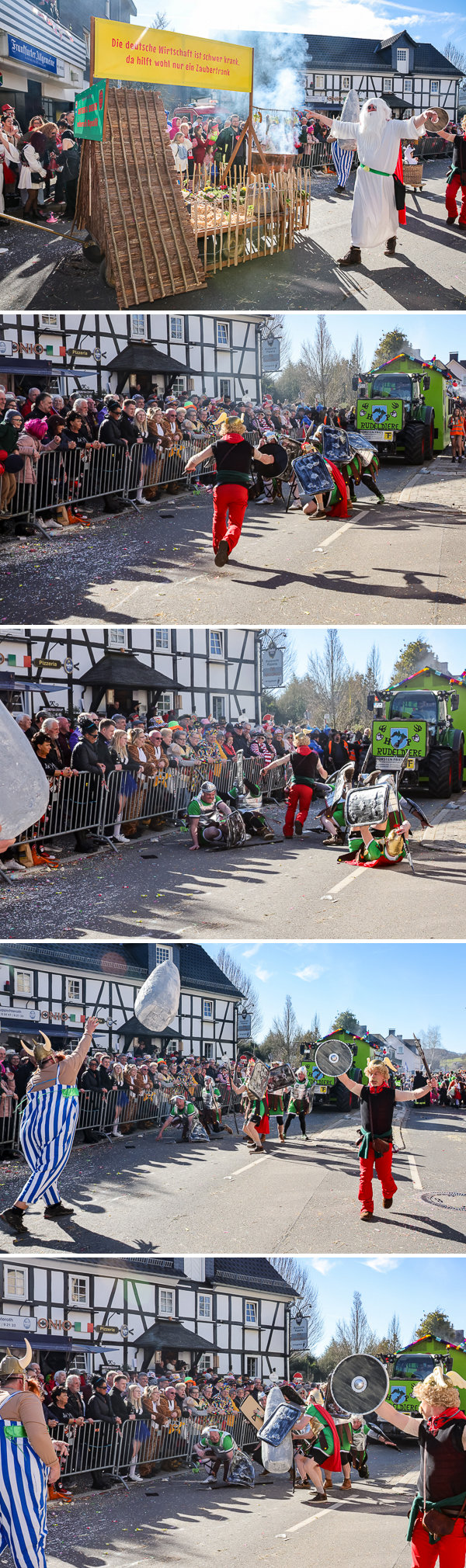 Auf den Morsbacher Kegelclub „Knalldrop“ kann man sich verlassen! Seit Jahren präsentieren die Karnevalisten stilsicher einige der schrägsten Ideen und besten Choreographien im Morsbacher Rosenmontagszug. Vor zwei Jahren noch als Klimakleber aktiv hatte es die Truppe in diesem Jahr nach Gallien zu Asterix und Obelix verschlagen. Die römischen Legionäre wurden von Asterix nach Genuss des Zaubertranks reihenweise vermöbelt, anschließend ließ es Obelix neben Kamelle auch noch Hinkelsteine auf die armen Römer regnen.