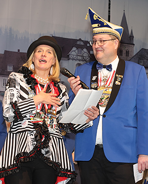 [Bürgermeisterin Anne Loth und Präsident René Löhr bei der Begrüßung der närrischen Gäste.]