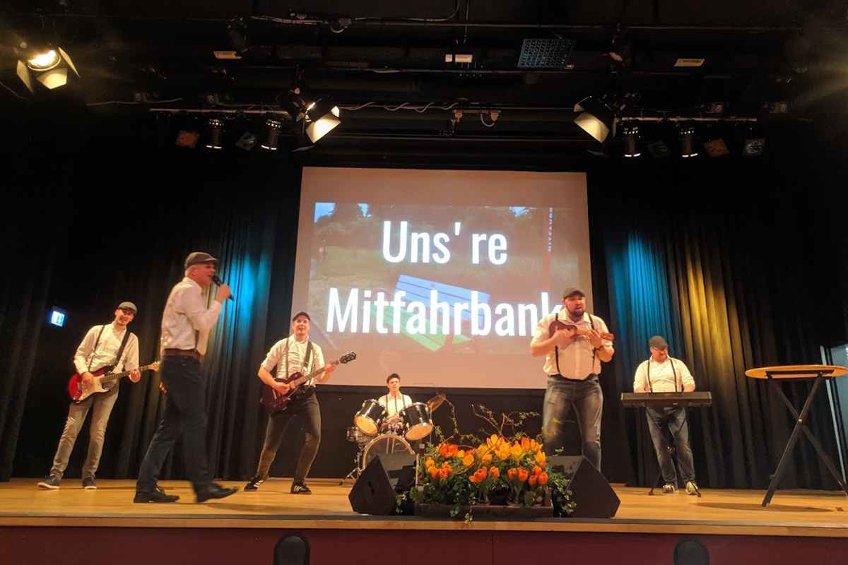 „Bel Kantholz“ gewährte den Zuschauern in ihrer Jubiläumsausgabe des „Flurschütz-TV“ einen Blick in ihr neues System, um mehr Mobilität zu schaffen - uns´re Mitfahrbank. Man braucht eine Bank, ein Schild „Mitfahrbank“ und dann ein weiteres Schild, wo es hingehen soll, ob zum Schwimmbad, nach Kömpel oder zur Schneewittchenbar. Nach ihrem phänomenalen Auftritt verabschiedete sich die Gruppe mit ihrer neuen „Republik-Hymne“.