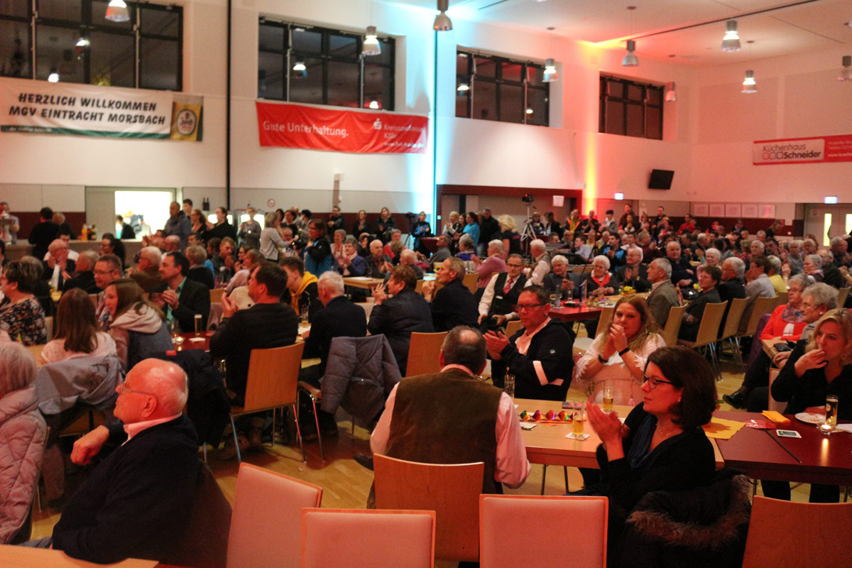 Gehaltvoll, ideenreich, witzig, inhaltsreich und auf jeden Fall hausgemacht - so war der traditionelle "Bunte Abend" des MGV Eintracht. Daniel Schneider, Vorsitzender des Männergesangvereins , begrüßte die zahlreichen Gäste und Ehrengäste in der Morsbacher Kulturstätte. Moderator Frank Rinscheid führte durch das Programm. Nach stimmgewaltigen Liedvorträgen der Eintracht, trat die Kindergarde der KG Morsbach mit schmissigen Tänzen auf. Die „alten“ Sängerfrauen zeigten köstliches Fußtheater. Sie hatten ihre Unterschenkel mit selbstgenähten schmucken Gewändern versehen, ihre Knie mutierten zum Gesicht und trugen kleine Hütchen. So verwandelten sich ihre Unterschenkel in eigenständige Persönlichkeiten, mit denen sie flotte Tänzchen vorführten. Mit den Mini-Wolpertinger ging es auf Weltreise. Sie faszinierten die Zuschauer mit ihrem Tanz, der eine bunte Reise um die Welt und wieder zurück nach Morsbach zeigte.