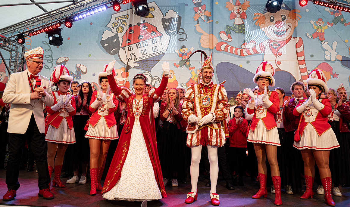 „Mer fiere et Levve mit Tradition und Narretei!“ - so heißt das diesjährige Sessionsmotto der Karnevalsgesellschaft Rot-Weiß Denklingen, das sie in der ausverkauften Prunksitzung mit vielen Jecken feierten. „Pass up, Prinzessin“ sang Prinz Stefan III. seiner Prinzessin Jessica zu. Jessica und Stefan Langensiepen ziehen seit Anfang Januar gemeinsam mit Gefolge und einer Menge Spaß durch die oberbergischen Säle. „Eigentlich sind sie ganz neu im Karnevalsgeschäft“, so KG-Präsident Hansi Welter. „Aber sie und ihr Gefolge sind dabei, als ob sie nie was anderes gemacht hätten.“ Dafür forderte eine Rakete ein, die von den Piraten, Waldelfen, Hippies, Seifenblasen, Eistüten, Harlekinen und Prinzessinnen natürlich sofort umgesetzt wurde.