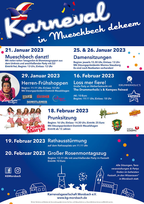 Am 29. Dezember ab 16 Uhr führt die Karnevalsgesellschaft Morsbach im Bistro „Alt Morsbach“ den Ticketverkauf für die anstehenden Veranstaltungen durch. Es gibt Karten für den Herrenfrühschoppen, die Prunksitzung sowie die letzten Exemplare für die fast ausverkauften Damensitzungen. Tickets für die Damensitzungen 2024 können vorbestellt werden. Weitere Informationen sind hier zu finden.