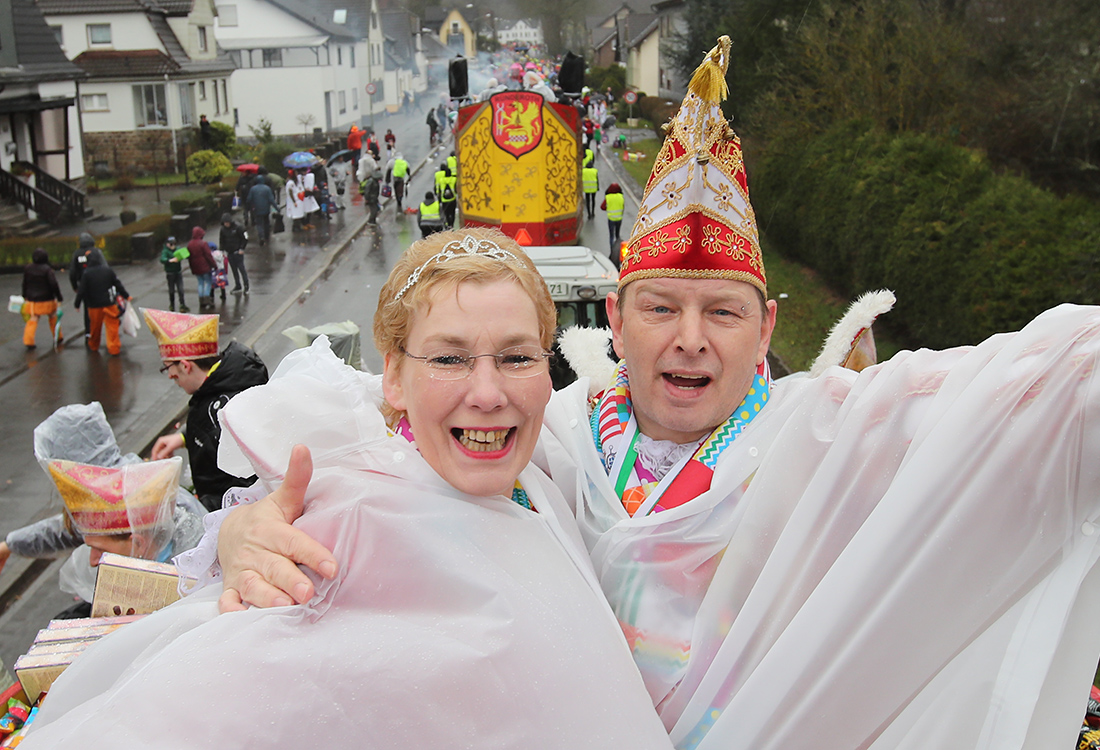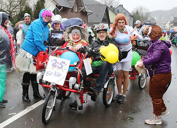 Engelskirchen - Die Jecken ließen sich von dem Wetter nicht die Karnevalsfeierei verderben und färbten die Kommune bunt - 38 prächtig geschmückte Wagen verteilen zurzeit neben Leckereien auch gute Laune.