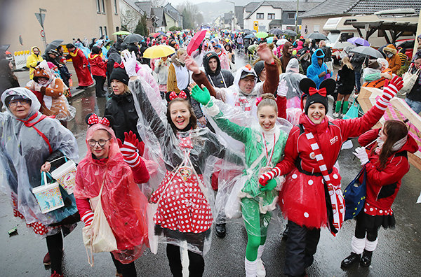 Gegen 13:45 Uhr spielte der Wettergott den Karnevalisten in Ründeroth einen Streich und versuchte ihnen den Zug zu vermiesen. Jedoch rechnete er nicht mit der Kraft, die die Oberberger aus ihrer Liebe zum Fastelovend herzaubern konnten. Insgesamt formierten sich 38 bunt geschmückte Wagen, um die sich etliche wetterfeste Jecke versammelten, die den kleinen und großen Kindern Kamelle zukommen lassen wollten. "Wir haben besondere Maßnahmen ergriffen. Alle sollen heute Spaß haben können und das Dorf soll voll sein", berichtete Schirrmeisterin Angelika Peterson kurz vor dem Start. Die von Traktoren gezogenen Wagen wurden teils nachgerüstet und stabilisiert, um dem Sturm zu trotzen.