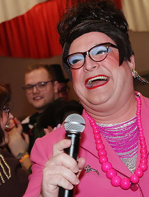 Comedy-Dame Lieselotte Lotterlappen präsentierte sich „im Bernsteinzimmer der guten Laune“ wie gewohnt mit deftigen Sprüchen, vor denen selbst Bergneustadts Bürgermeister Matthias Thul, gekleidet im Rokoko-Outfit, nicht verschont blieb. „Du musst ein bisschen aufpassen, du hast das Adventshöschen an. Da ist das Türchen noch offen.“