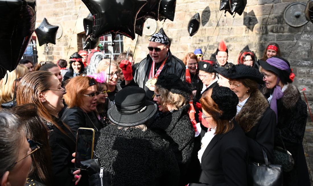 Dort war, im versperrten Zugang, heuer bei strahlendem Sonnenschein erneut die große Gelegenheit den Rathausschlüssel wenigstens einmal erfolgreich zu verteidigen. Aber es kam auch 2025, wie es kommen musste: Beim letzten Versuch während seiner noch bis September andauernden Amtszeit ließ man dem Rathauschef und seinen Mitarbeitern, die bunt und langhaarig als Rocker oder Punker verkleidet waren, nicht den Funken einer Chance. Schnell war die Barriere durchbrochen und die Möhnen zogen unter viel Applaus auf die Bühne, um dort ihren Erfolg mit den jecken Wievern und dem weiteren, kostümierten Volk zu feiern.