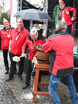 Beim obligatorischen Fassanstich, dem Engelmann bereits mit einem mulmigen Gefühl entgegensah, zeigte sich der Zapfhahn dann tatsächlich recht unkooperativ. Da half auch kein mehrfaches Draufschlagen. Erst nach einem neuen Ansetzen funktionierte es wie erhofft und das Freibier strömte in die Gläser, die durstigen Kehlen wurden umgehend versorgt. Das "Duo Pascal" aus Bergisch Gladbach machte mit gängigen Liedern den musikalischen Eisbrecher und entlockte dem jecken Volk die ersten Töne.