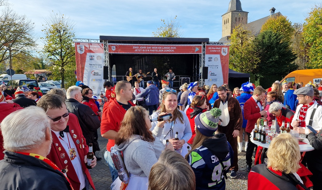 Lindlar – Die KG Rot-Weiß startet mit buntem Bühnenprogramm in die Session – Marktplatz im Ort gut gefüllt.