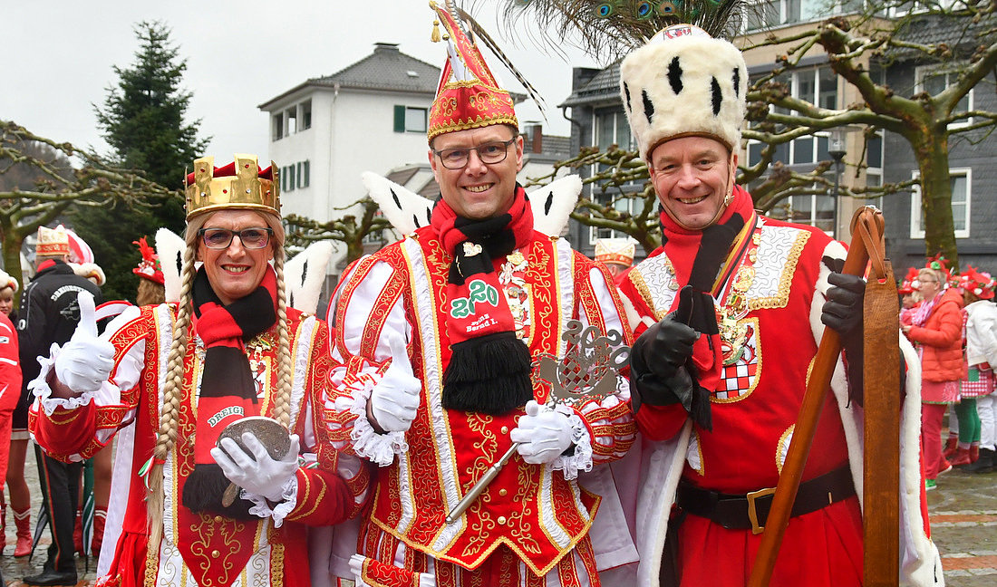 Mit Regenschirmen bewaffnet fanden sich nach und nach Abordnungen der KG Närrische Oberberger und etliche bunt gekleidete Jecke bei leichtem Regen, wie von den närrischen Oberhäuptern bei deren Proklamation Mitte Januar (oa berichtete) festgelegt, gegen 14 Uhr auf dem Edmund-Schiefeling-Platz ein. „Engelskirchen ist bunt und jeck“, erklärten Prinz Bernd I., Bauer Rainer und Jungfrau Steffi. „Unser Schmölzchen steht dafür, mit den Jecken zu feiern.