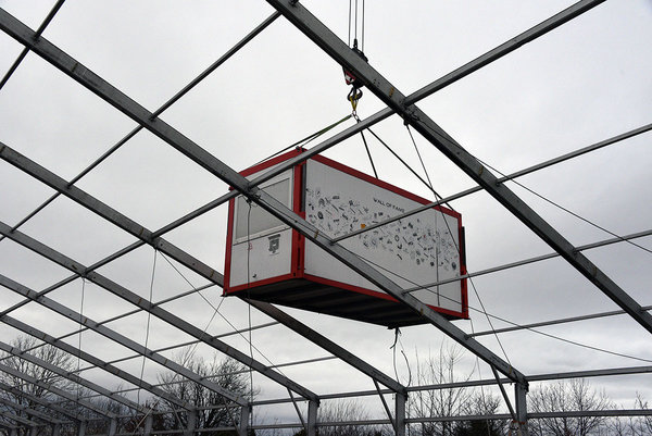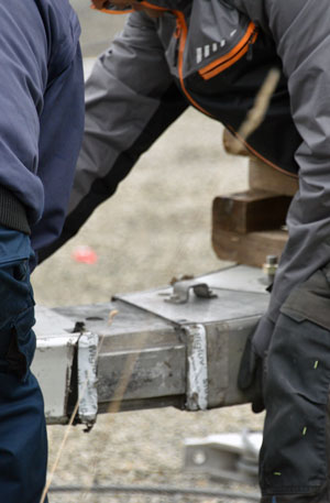 [... sondern auch beim Manövrieren des Küchencontainers durch die Dachkonstruktion.]