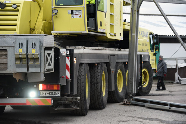 Auch wenn die Zeltaufbau-Mannschaft ein eigenspieltes Team ist, werden die Streben in beeindruckender Geschwindigkeit zusammengesteckt. Die Betonung liegt dabei auf Stecken, denn Schrauben sind bei der ausgeklügelten Metallkonstruktion nicht nötig. Lediglich Sicherheitsbolzen werden beim Karnevalszelt, das sich nach dem Aufbau selbst trägt, angebracht. Doch so einfach wie der Aufbau eines Campingzeltes ist das Ganze dann doch nicht. Fünf Lkw-Ladungen sind aus dem Firmensitz im südhessischen Lützelbach (Odenwaldkreis), mit einem Gesamtvolumen von rund 100 Tonnen nach Lindlar transportiert worden. Und auch das Aufstellen der „Zeltstangen“ ist ohne technisches Großgerät nicht möglich. Ein Kran, der bis zu 160 Tonnen bewegt, wurde deswegen nach Lindlar beordert und richtet Bauteil für Bauteil auf der Fläche von 65 Mal 36 Metern auf.