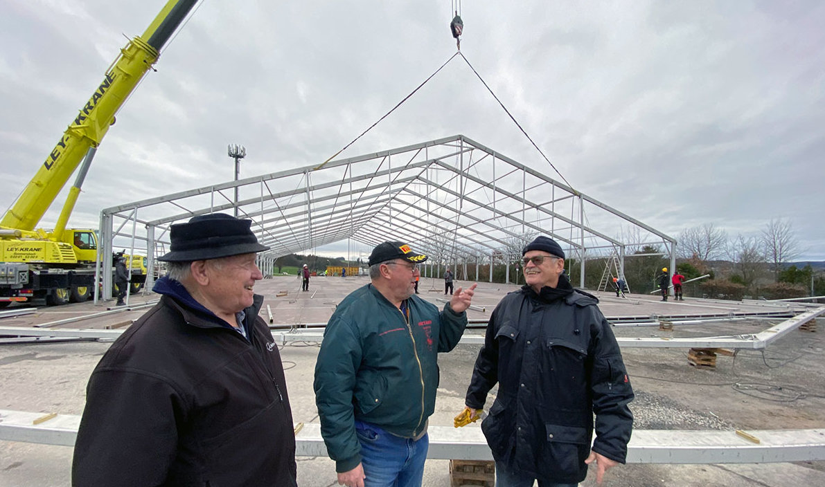 Bereits am Tag zuvor wurden durch die Mitarbeiter der Fachfirma auf einer Fläche von rund 600 Quadratmetern Bodenplatten verlegt. Als die letzte Querstrebe verbaut ist, rollt „wie bestellt“ Landwirt Werner Lob mit seinem Unimog samt wichtiger Fracht auf dem Trailer am Ort des Geschehens an. Auf dem Anhänger befindet sich der vereinseigene, vier Tonnen schwere Küchencontainer: „Hier sind schon viele Künstler durch unsere Frauen bekocht worden“, sieht sich Brocks mit diesem besonderen „Cateringservice“ im Vorteil gegenüber Mitveranstaltern, wenn es um das Buhlen bei der Künstlerverpflichtung geht. „Die Höhner kommen besonders gerne zu uns. Wegen der leckeren Speisen“, sagt der Narrenchef mit einem Schmunzeln und nennt weitere Vertreter aus der „Champions League“ des Kölschen Karnevals, die frühzeitig einen Vertrag für das „Comeback“ im nächsten Jahr, vielleicht genau aus diesem Grund, unterschrieben haben.