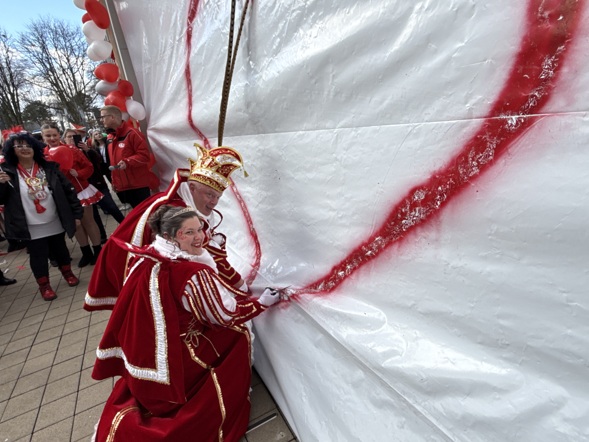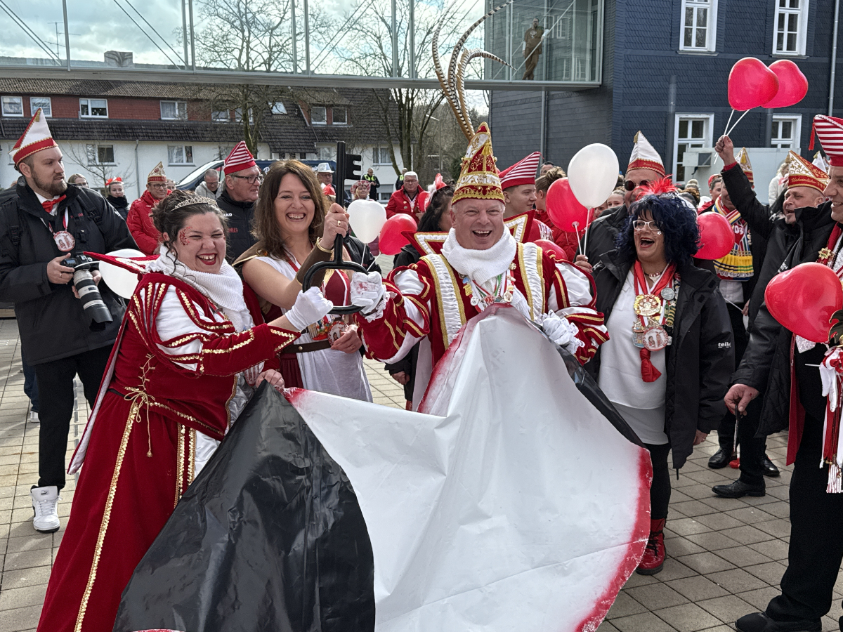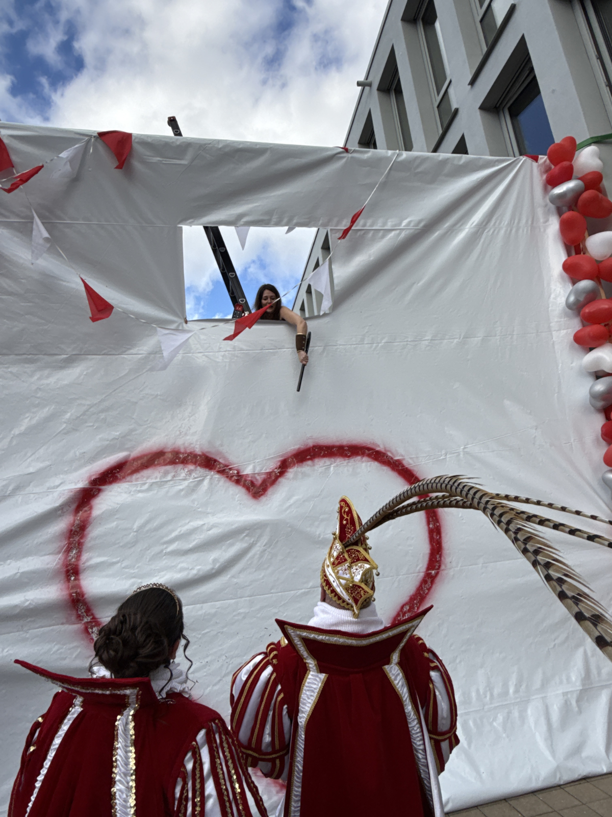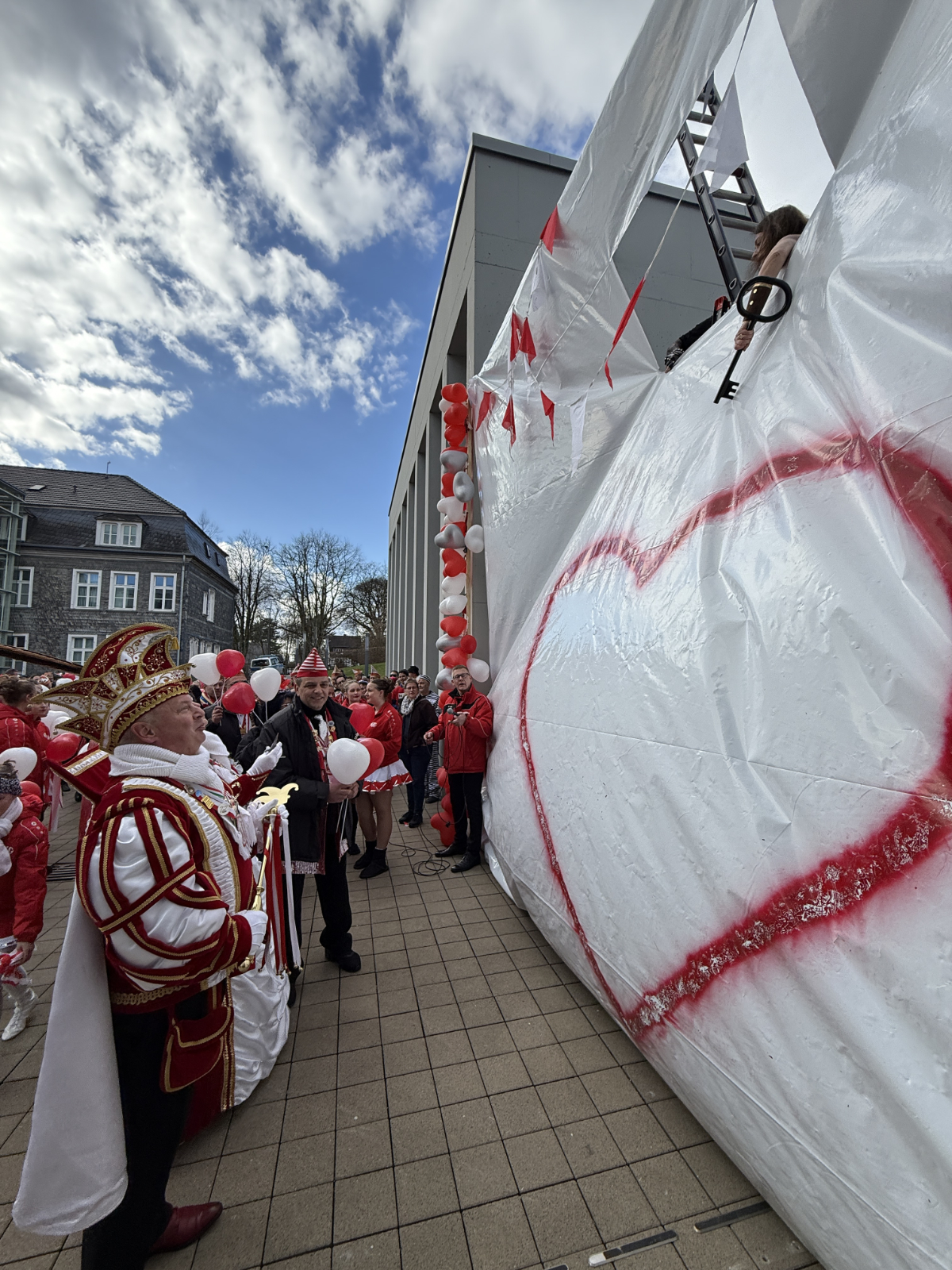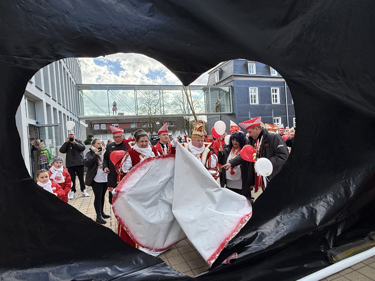 Dabei hatten es die "Stadtsoldaten" den Tollitäten besonders schwer gemacht. Zunächst hieß es für die Schönenbacher, rot-weiße Bänder zu durchtrennen. Am eigentlichen Eingang prangte dann ein übergroßes Herz. In luftiger Höhe gab das „Burgfräulein“ Larissa Weber Anweisungen zur Einnahme der „Liebesfestung“: „Ihr seid nun 25 Jahre ein Paar und müsst nun durch das Herz dringen“, so die Aufgabe für die Tollitäten. Nach einigen Minuten harter Arbeit mit der Schere war die „Wand“ zum Rathaus durchtrennt. Als letzte Bastion warteten die „Verwaltungsrocker“ vor dem Eingang. Aber auch sie ergaben sich der jecken Übermacht und der Rathausschlüssel wurde übergeben.