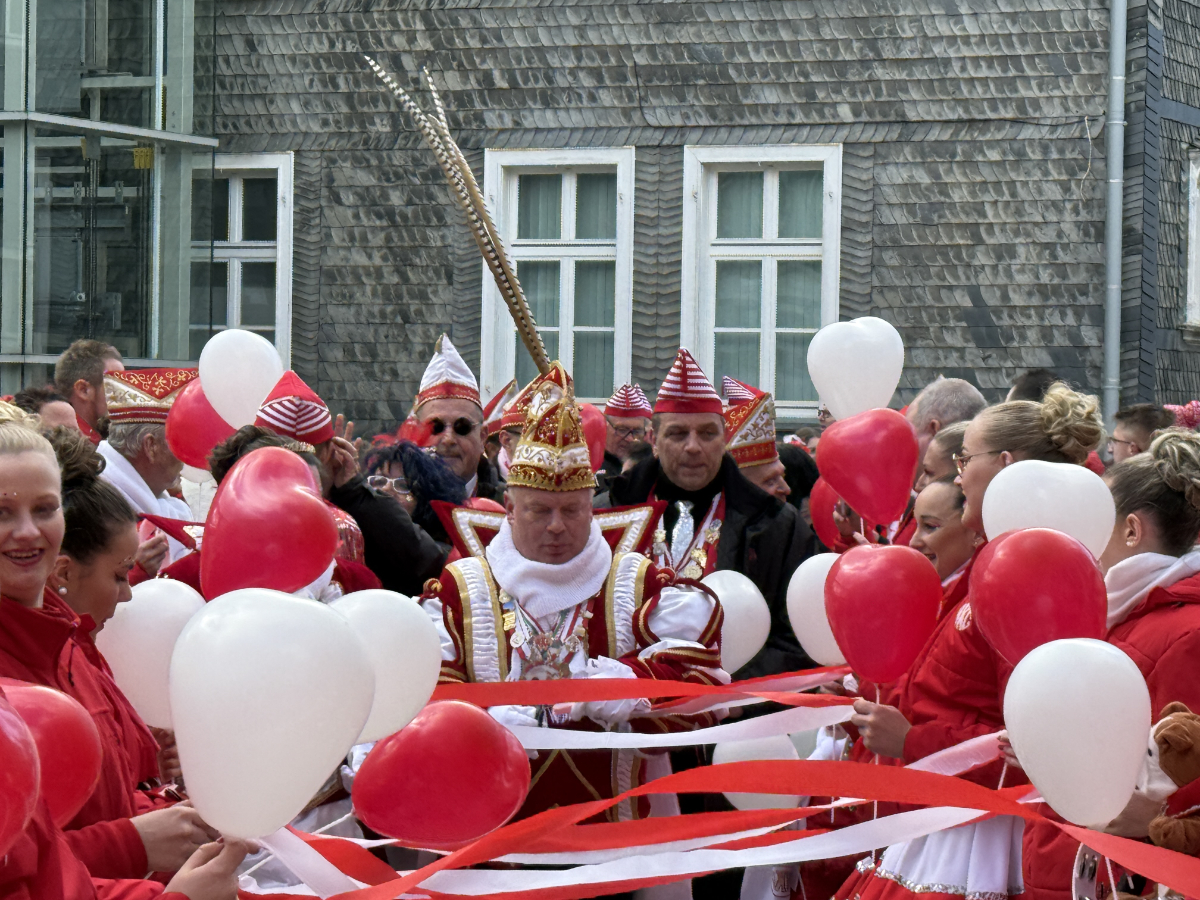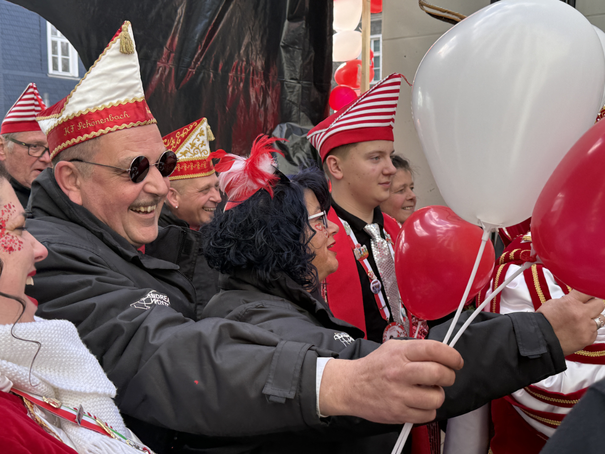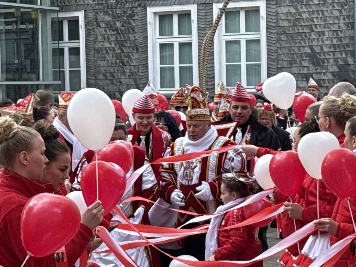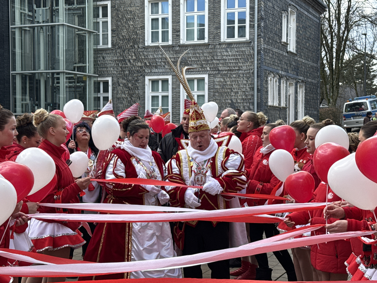 Dabei hatten es die "Stadtsoldaten" den Tollitäten besonders schwer gemacht. Zunächst hieß es für die Schönenbacher, rot-weiße Bänder zu durchtrennen. Am eigentlichen Eingang prangte dann ein übergroßes Herz. In luftiger Höhe gab das „Burgfräulein“ Larissa Weber Anweisungen zur Einnahme der „Liebesfestung“: „Ihr seid nun 25 Jahre ein Paar und müsst nun durch das Herz dringen“, so die Aufgabe für die Tollitäten. Nach einigen Minuten harter Arbeit mit der Schere war die „Wand“ zum Rathaus durchtrennt. Als letzte Bastion warteten die „Verwaltungsrocker“ vor dem Eingang. Aber auch sie ergaben sich der jecken Übermacht und der Rathausschlüssel wurde übergeben.