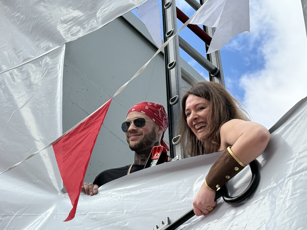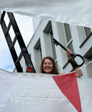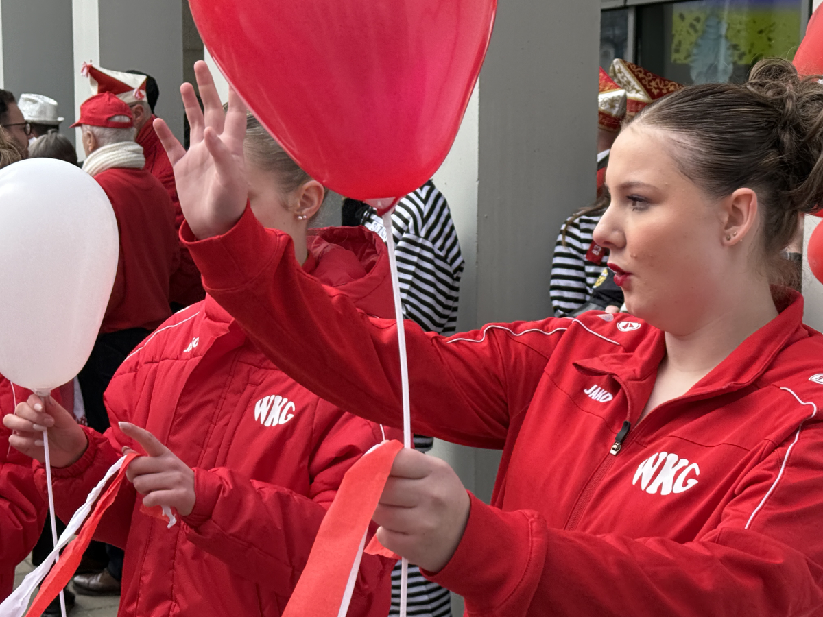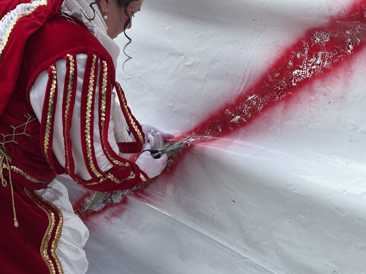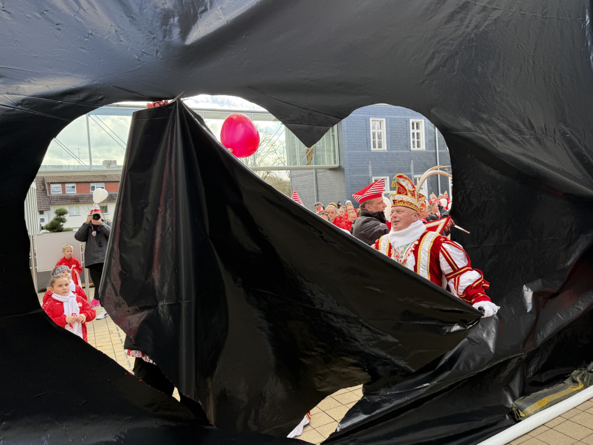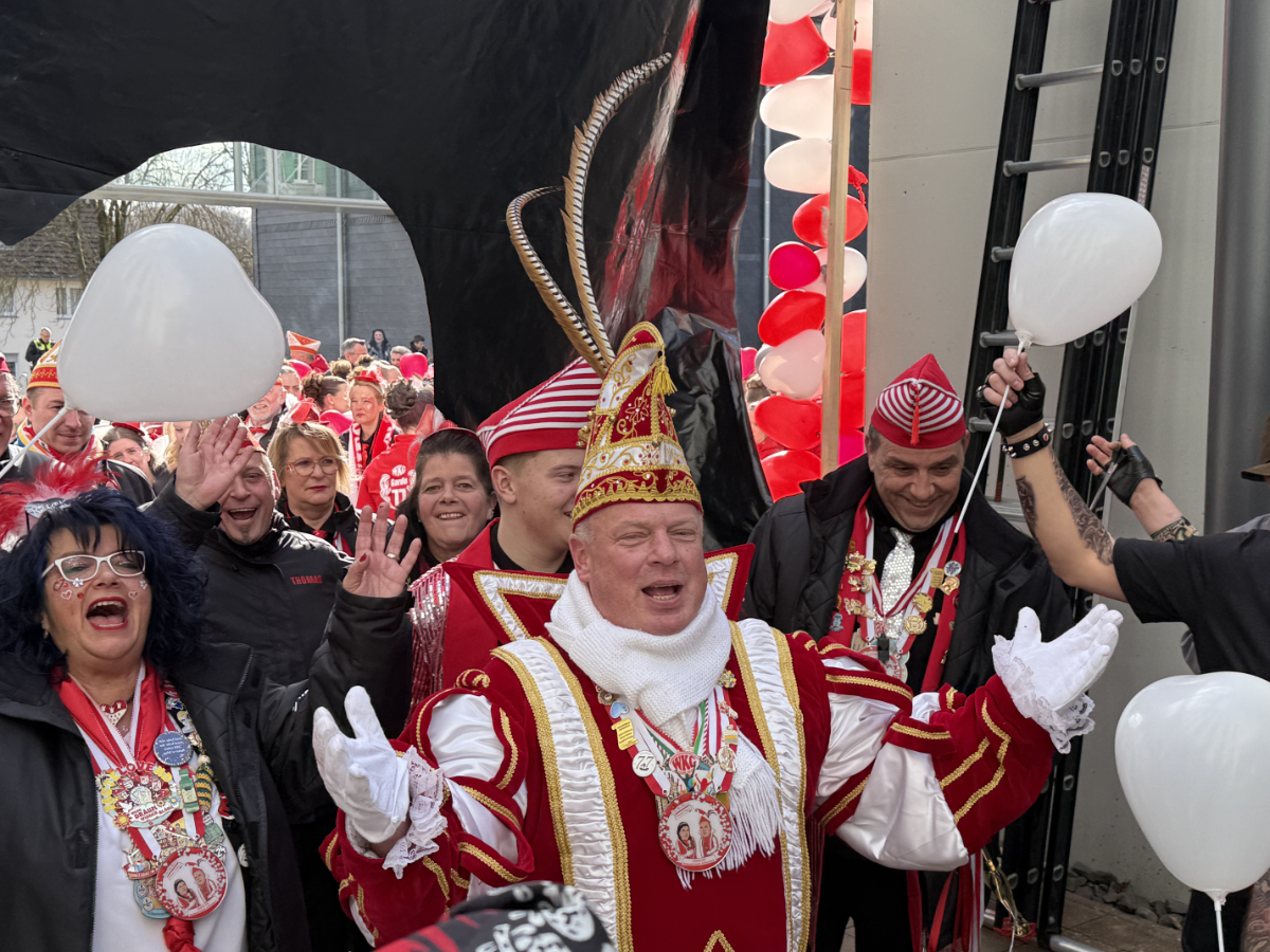 Dabei hatten es die "Stadtsoldaten" den Tollitäten besonders schwer gemacht. Zunächst hieß es für die Schönenbacher, rot-weiße Bänder zu durchtrennen. Am eigentlichen Eingang prangte dann ein übergroßes Herz. In luftiger Höhe gab das „Burgfräulein“ Larissa Weber Anweisungen zur Einnahme der „Liebesfestung“: „Ihr seid nun 25 Jahre ein Paar und müsst nun durch das Herz dringen“, so die Aufgabe für die Tollitäten. Nach einigen Minuten harter Arbeit mit der Schere war die „Wand“ zum Rathaus durchtrennt. Als letzte Bastion warteten die „Verwaltungsrocker“ vor dem Eingang. Aber auch sie ergaben sich der jecken Übermacht und der Rathausschlüssel wurde übergeben.