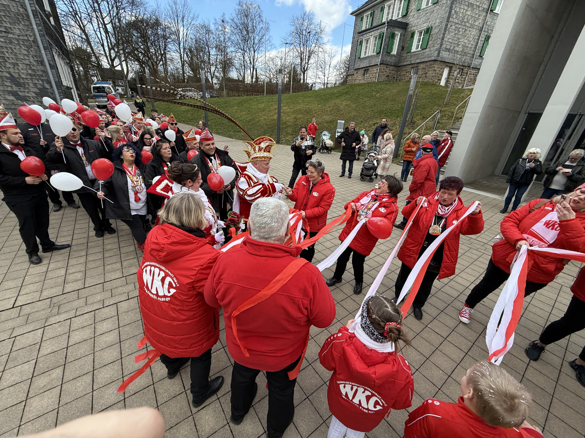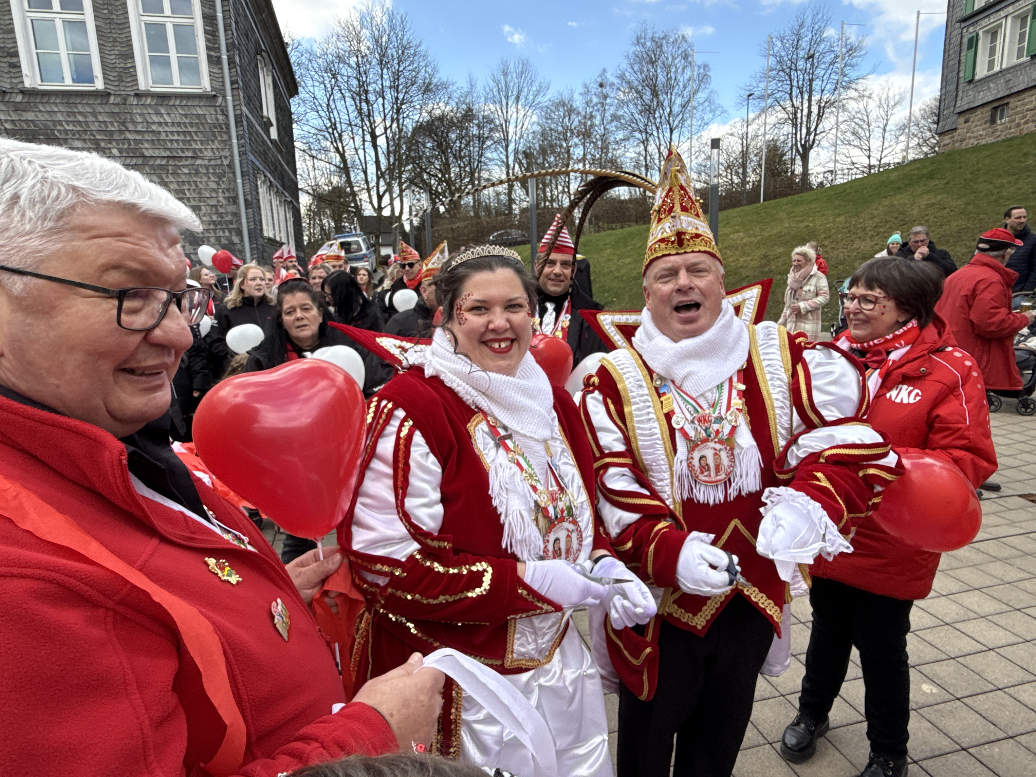 Seit 13:11 Uhr ist das Waldbröler Bürgerdorf fest im Jeckenhand. Der Widerstand von Bürgermeisterin Larissa Weber und ihrem städtischen Gefolge hielt der närrischen Übermacht der Waldbröler Karnevalsgesellschaft und den Karnevalsfreunden aus Schönenbach mit deren Prinzenpaar Jörg-Oliver und seiner Tanja nur kurz stand.