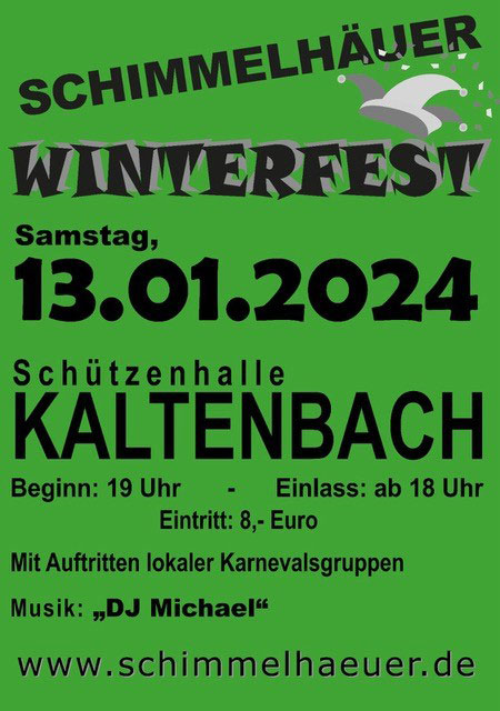 Das karnevalistische Winterfest des Schützenvereins Kaltenbach/Bellingroth („Die Schimmelhäuer“) findet am Samstag, 13. Januar, ab 19 Uhr, in der Schützenhalle Kaltenbach statt. Nach der Begrüßung durch Sitzungspräsident Thomas Schmitt werden lokale Karnevalsgruppen auftreten. Anschließend sorgt DJ Michael für Musik.