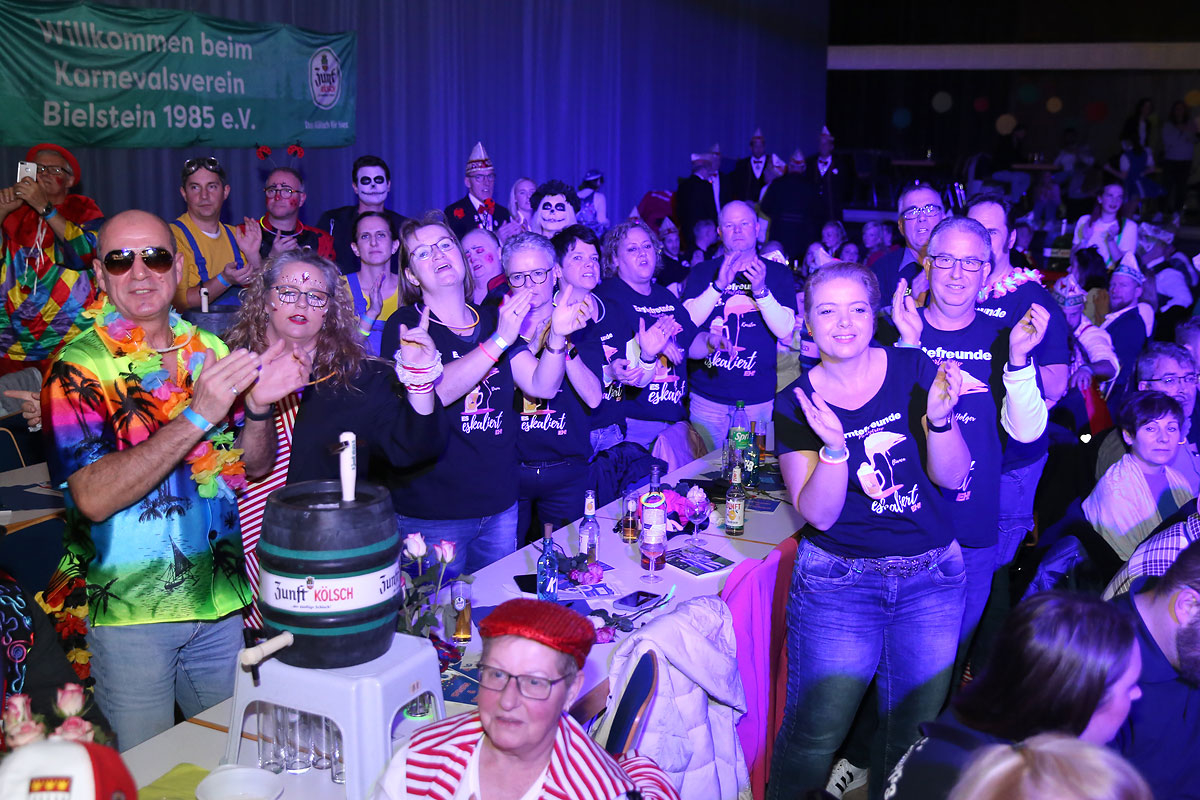In der gut gefüllten Aula des Schulzentrums Bielstein trafen sich zahlreiche Kostümierte und befreundete Vereine zur Proklamation des Karnevalsverein Bielstein. Nach Begrüßung durch den Vorsitzenden Michael Röser und Sitzungspräsident Tobias Rhode nahm das scheidende Dreigestirn, bestehend aus Prinz Michael, Bauer Zimbo und Jungfrau Hermine, ein letztes Bad in der Menge. Mit dem einen oder anderen Liedchen sagte das Trio „Tschüss“ und machte Platz für die neuen Regenten.