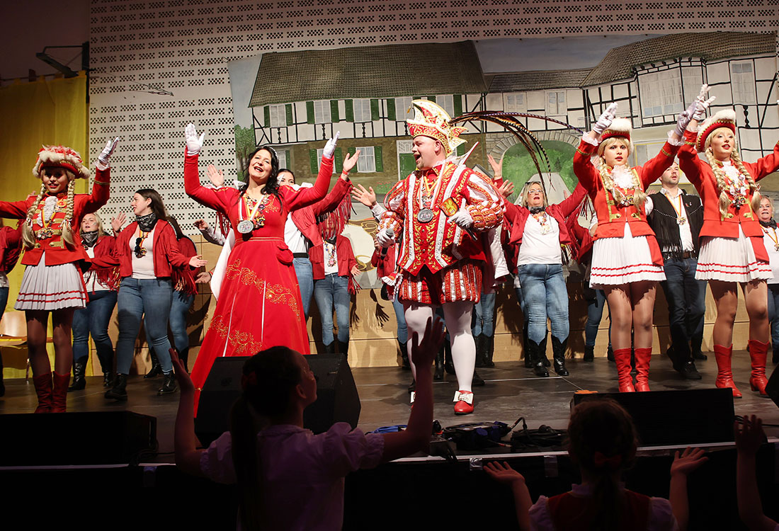 Mit einem ersten Sessionslied „Alaaf“ überreichte das Prinzenpaar samt Gefolge eine musikalische Visitenkarte ans Karnevalsvolk, das von den fünf Hürther Jungs von „Palaver“ zum Mitsingen und Mitmachen nur an die Hand genommen werden musste. Im Der Auftritt der Mädelstanzgruppe „Aggerperlen“ bot ganz großes Kino, bei dem die Liebe zur fünften Jahreszeit förmlich greifbar wurde.