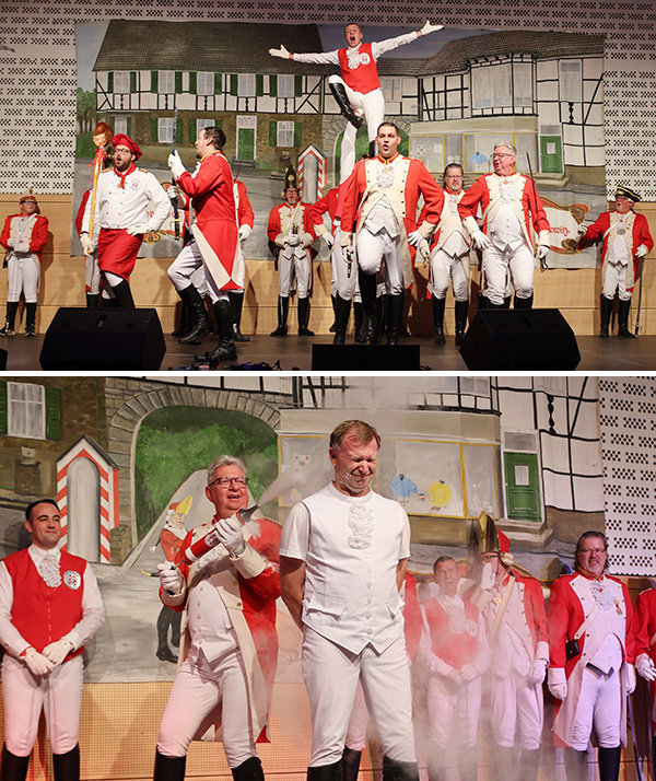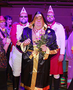 Danach endlich präsentierten sich mit der Torwache Ründeroth die „schönsten Männer Ründeroths“ dem Publikum und rissen die Saalgäste mit ihrem Liebreiz und ihrer herben, aber herzlichen Performance zu begeistertem Beifall und anerkennenden Pfiffen hin. Mit Trainerin Anna Ecker hatten die bärtigen Grazien drei Tänze einstudiert, die geballte Manpower mit dynamischem Hüftschwung und gekonnter Akrobatik kombinierten. Als neues Mitglied in den Reihen der ehrwürdigen Torwache wurde „Hüppetüpp“ von seinen Korps-Kameraden öffentlich ordentlich gepudert.