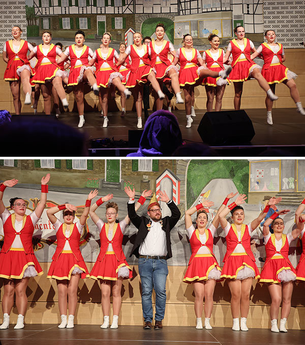 Seine Kompanie ermöglichte dem „Testosteron-Tornado“ im Kickboxer-Mantel den triumphalen Einmarsch auf die große Bühne, wo Kappes im Applaus der Jecken förmlich badete. Danach hieß der persönliche Moderator der RKV Sparkly Dancers seine rot-weiße Tanz-Formation in Ründeroths Gürzenich willkommen, wo die 18 Tänzerinnen und Tänzer den neuen Engelskirchener Bürgermeister Lukas Miebach direkt einem Tanz-Tauglichkeitstest unterzogen.