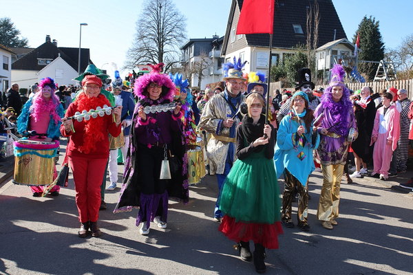 Und besonders farbenfroh präsentierten sich die insgesamt 45 teilnehmenden Gruppen - auch diese Zahl bedeutet einen Rekord seit dem Ende der Pandemie - dieses Mal. Es war ein Zug der runden Geburtstage: Allen voran die gastgebende KG Rot-Weiß-Lindlar. „Seit 20 Jahren feiern wir unsere Sitzungen im Zelt“, verriet Präsident Philipp Caucal das Motto „Kunterbunt und raderdoll, mache m´r de 20 voll“. „Silberhochzeit“ feierten in diesem Jahr die Musiker von Samba Loco, die seit 25 Jahren ein wenig Zuckerhut-Flair mit ihren brasilianischen Klängen in die Gemeinde bringen und zur Feier des Tages in Silber glitzernde Kostümen aufwarteten.