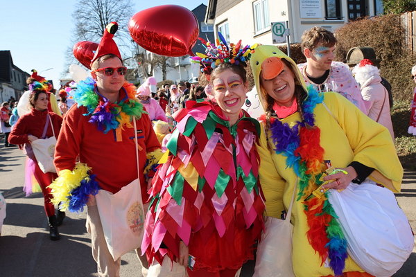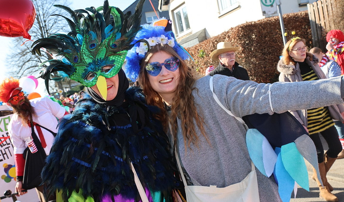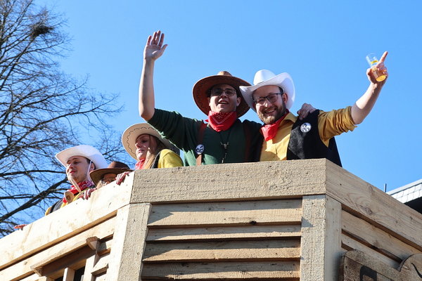 Die dunklen Zeiten aufhellen wollten die „Bunten Zochvögel“ aus Lindlar. Die 30 Narren nahmen als Premierengäste teil und planen nun, ihr jeckes Engagement in Zukunft auszubauen. „Wir möchten ein Zeichen für Vielfalt und Toleranz setzen“, berichtete Carina Daffe. Sie hatte die Gruppe gemeinsam mit Jannika Ellerich im vergangenen Jahr in Leben gerufen. Offensichtlich ganz hoch im Kurs stand in diesem Jahr Comicheld Lucky Luke. Der urige Cowboy war gleich an drei Mottowagen vertreten.