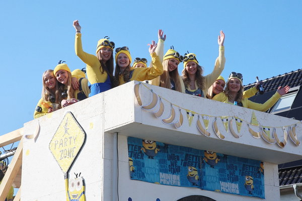 „Wir holen uns die Kindheit zurück“ , sagte Jonas, der mit 25 Kumpels und Freundinnen aus Overath-Vilkerath ebenfalls zum ersten Mal in Lenkeln vertreten war. „Wir wollen keine schnöden Cowboys sein“, meinte Mika aus Bechen zur Mottowahl seiner 25-köpfigen Truppe. Der Freundeskreis aus Kürten und Lindlar hatte sogar ein dreidimensionales Ebenbild des Westernhelden aus Kaninchendraht und Pappe geformt. „Meine Nachbarin ist Wagenbauerin beim Kölner Rosenmontagszug und hat uns wertvolle Tipps zum Bau gegeben“, meinte Nina Fitzner, die sich unter anderem um die Kostüme der Truppe gekümmert hatte. „Erstlingstäter“ waren auch die Minions der Landjugend aus Engelskirchen. Die 40 jungen Leute im Alter zwischen 16 und 25 haben sich seit dem Sommer auf die jecken Tage vorbereitet und über ihr Kostümoutfit zuvor demokratisch abgestimmt.
