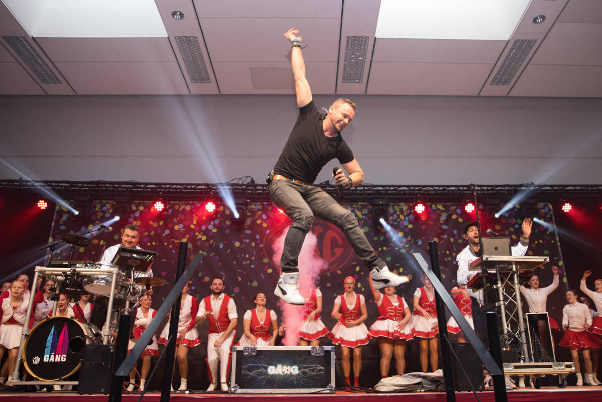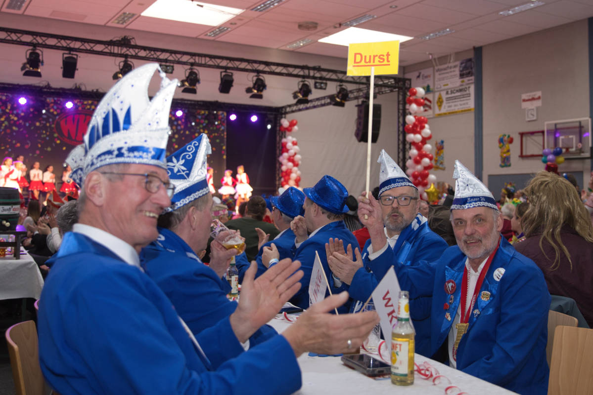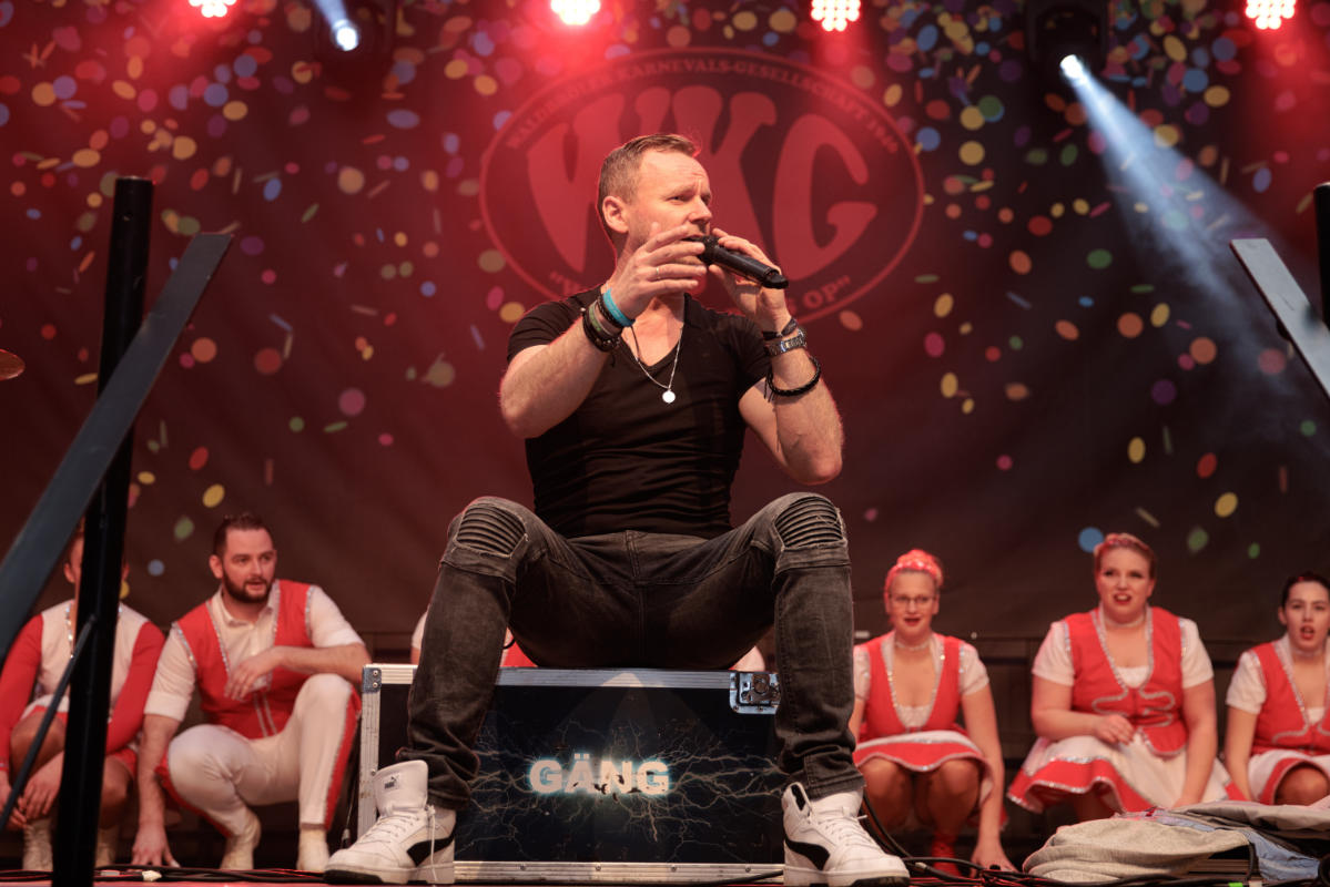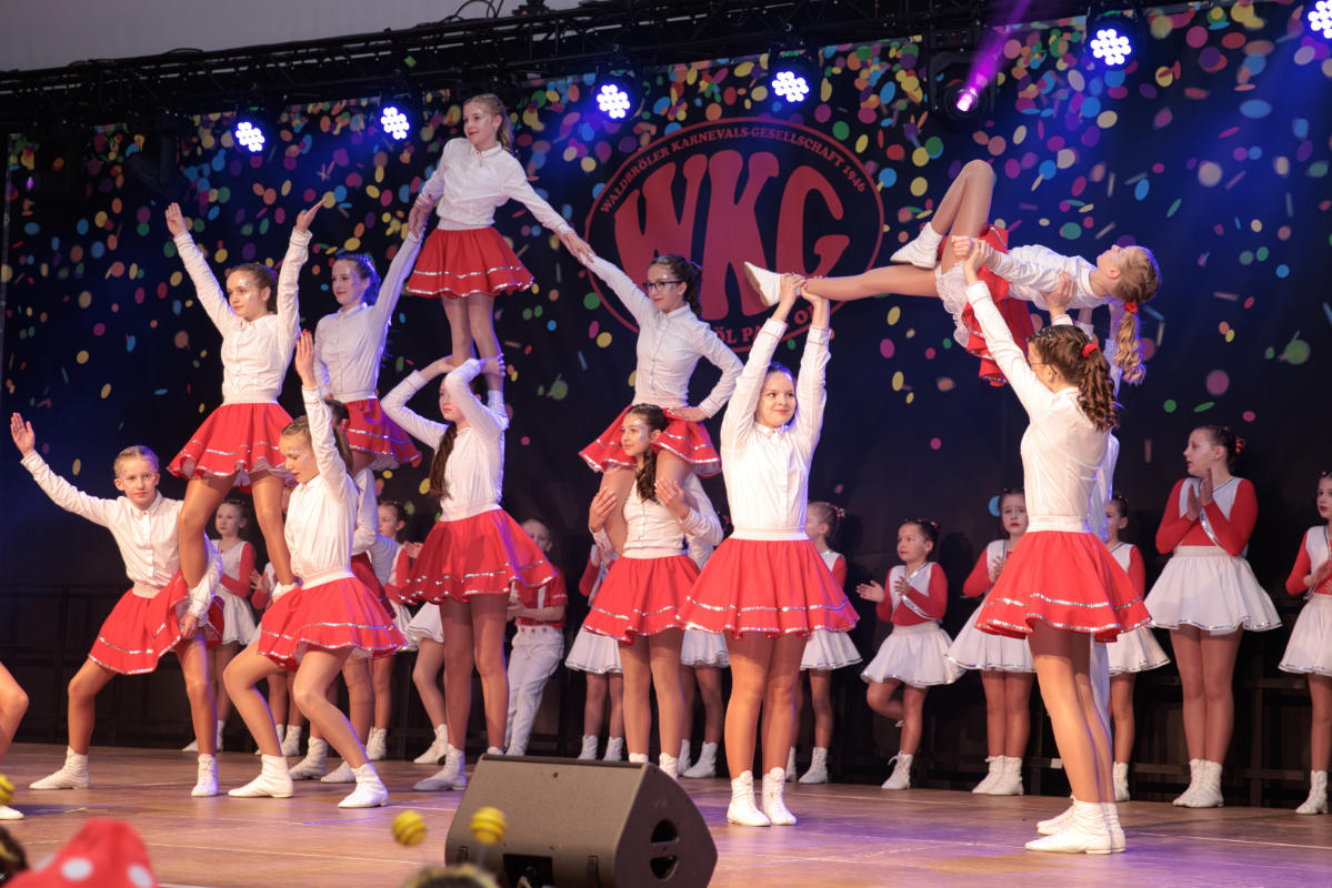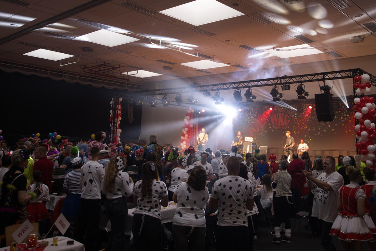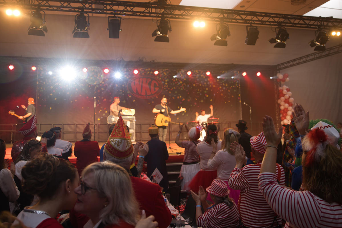 Mit dem Einzug der Garden begann auch das vollgepackte Karnevalsprogramm. Die Tanz Garden 2 und 88 der WKG begeisterten das närrische Publikum mit ihren Showeinlagen. Die Bands Kuhl un de Gäng, Fiasko, Bel Air, Lossjonn, Lupo und Big Maggas schossen eine Stimmungskanone nach der anderen ab. Die Jecken sangen viele Stücke lauthals mit, schunkelten, tanzten und freuten sich über das musikalische Feuerwerk und den Konfetti-Regen.