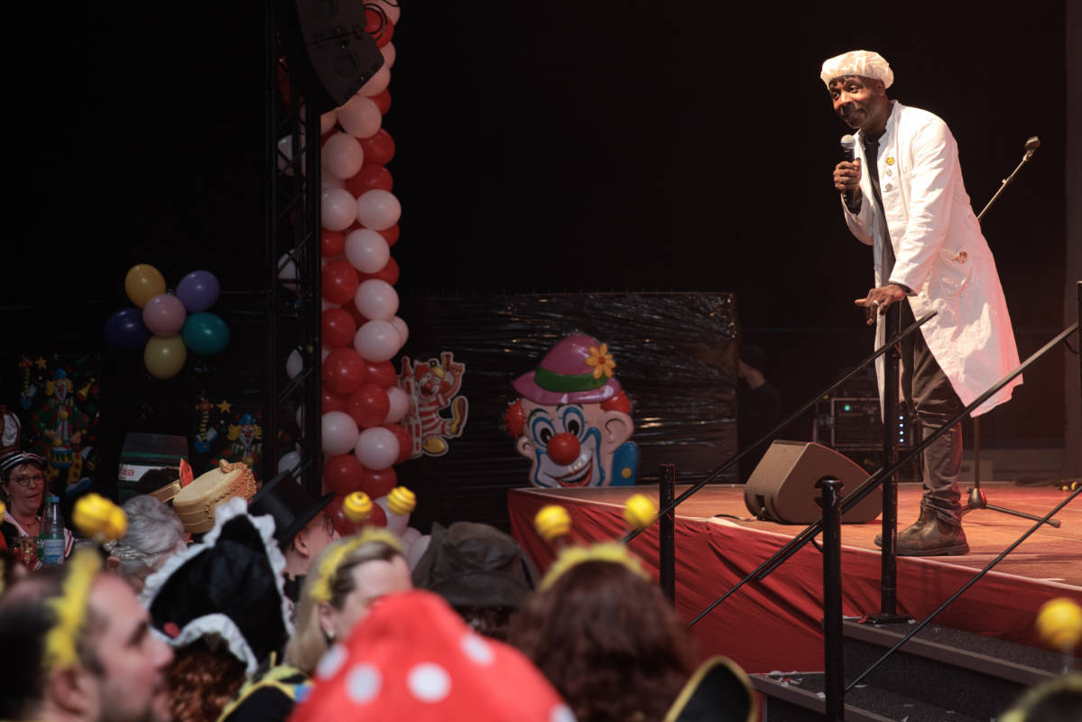 Für den Kabarettist Dave Davis, besser bekannt als Toilettenfachkraft Motombo, war der Auftritt in Waldbröl eine Premiere. „Ich bin begeistert. Läuft bei Euch“, sagte der Kölner Kabarettist. Er nahm die Politik auf die Schippe, machte sich über den sächsischen Dialekt und die Bayern lustig und versuchte sogar, mit Larissa Weber anzubandeln. Die Bürgermeisterin hatte sich für die Prunksitzung als Cleopatra verkleidet.