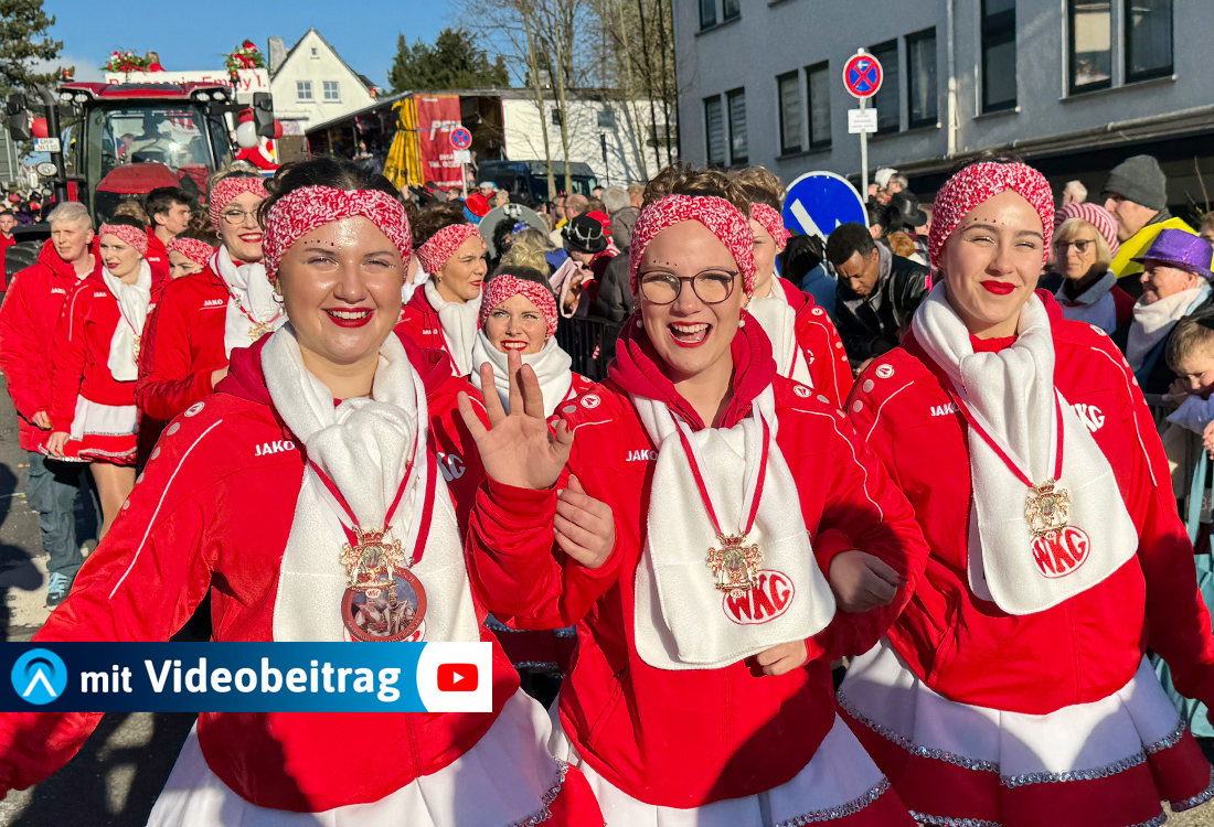 Zwar mit leichter Verspätung, aber sehnlichst von den Menschenmassen entlang der Straßen erwartet, hieß es kurz nach 14:11 Uhr endlich „D´r Zoch kütt“. Kenntnisreich kommentiert von Leo Wehling und Henning Hergt, vom Balkon der Familie Silmani am Kreisverkehr Bärenapotheke, schlängelte sich die kunterbunte Narrenparade über die Bahnhofstraße, weiter über Venn- und Talstraße Richtung Nutscheidhalle, wo die WKG-Jecken nach optischer Augenweide und gelungener Volksbelustigung eine zünftige Party steigen ließen. Narren aller Altersgruppen in sehenswerten Outfits und liebevoll angefertigten Kostümen warteten ausgerüstet mit Plastiktüten, Leinensäcken und Tragetaschen ungeduldig auf den zu erwartenden Kamelle-Regen entlang der Straßenränder.