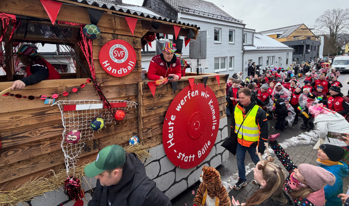 15 Anmeldungen verbuchten beide in diesem Jahr, drei weniger als 2025. Und auch die Straßen im Frielingsdorfer Zentrum waren weniger stark mit Jecken bestückt als in der Vergangenheit. Das war wohl dem neuerlichen Wintereinbruch geschuldet: „Uns ist das Wetter egal, wir feiern trotzdem mit Spaß und Freude“, lautete Wüstes Devise für den seit 1989 stattfindenden Umzug. Neue Gäste begrüßten die Planer zwar nicht, aber eine Gruppe ist enorm gewachsen. Die Handballer des SV Frielingsdorf waren im vergangenen Jahr noch mit einer Mini-Anordnung zum 100. Vereinsjubiläum dabei. Beim Premierenauftritt haben sie offensichtlich Lunte gerochen und gründeten im Sommer ein Organisationskomitee, besorgten sich aus Siegburg einen Wagen und waren nun heute mit sage und schreibe 90 Teilnehmern als größte Gruppe am Start.