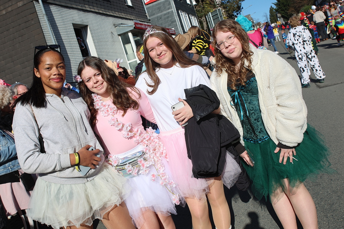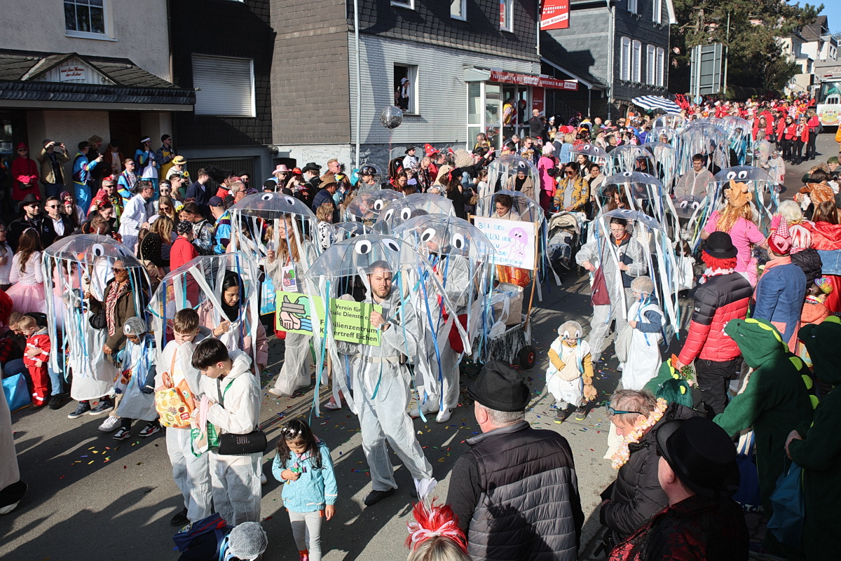 Die rund 300 Schüler, 20 Lehrkräfte und die ergänzenden Pädagogischen Fachkräfte hatten „Konfetti im Herzen“, die Fußgruppen der drei AWO- Kindergärten hatten sich in Disney-Stars und Märchenfiguren verwandelt, die Zwerge der Waldorf-Kita wuselten mit grünen Zipfelmützen und roten Capes durch die Marktstadt. Die Pänz des Familienzentrums Kindertreff Eichen dümpelten unter dem Motto „Bei den Quallen hier in Eichen, kann der Spaß uns stets erreichen“ als durchsichtige Gallerttiere an den Zuschauern vorbei.