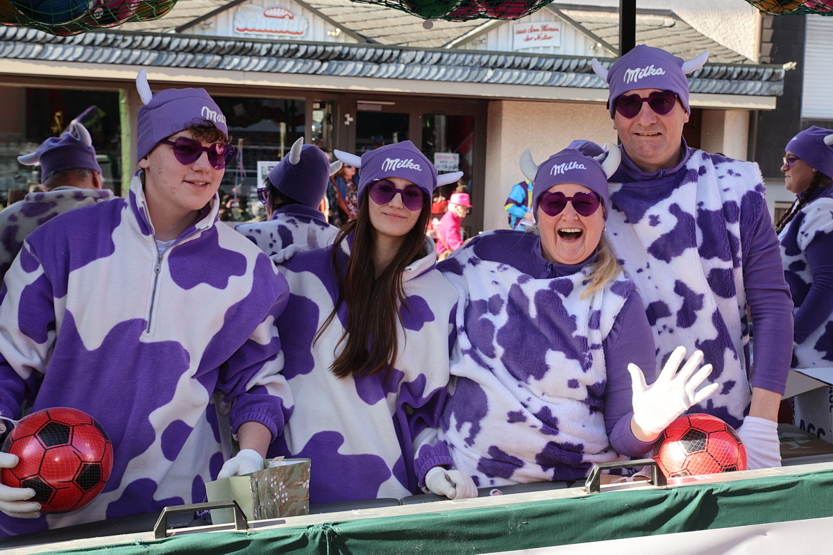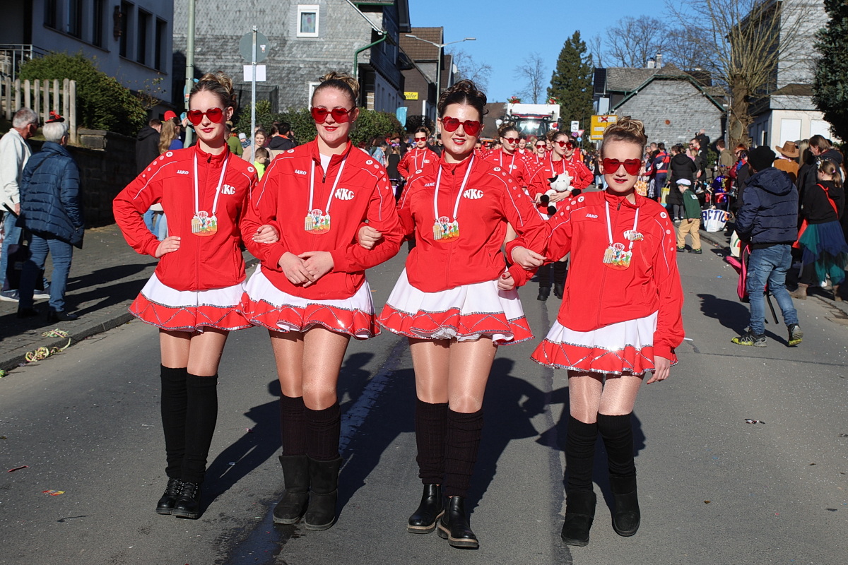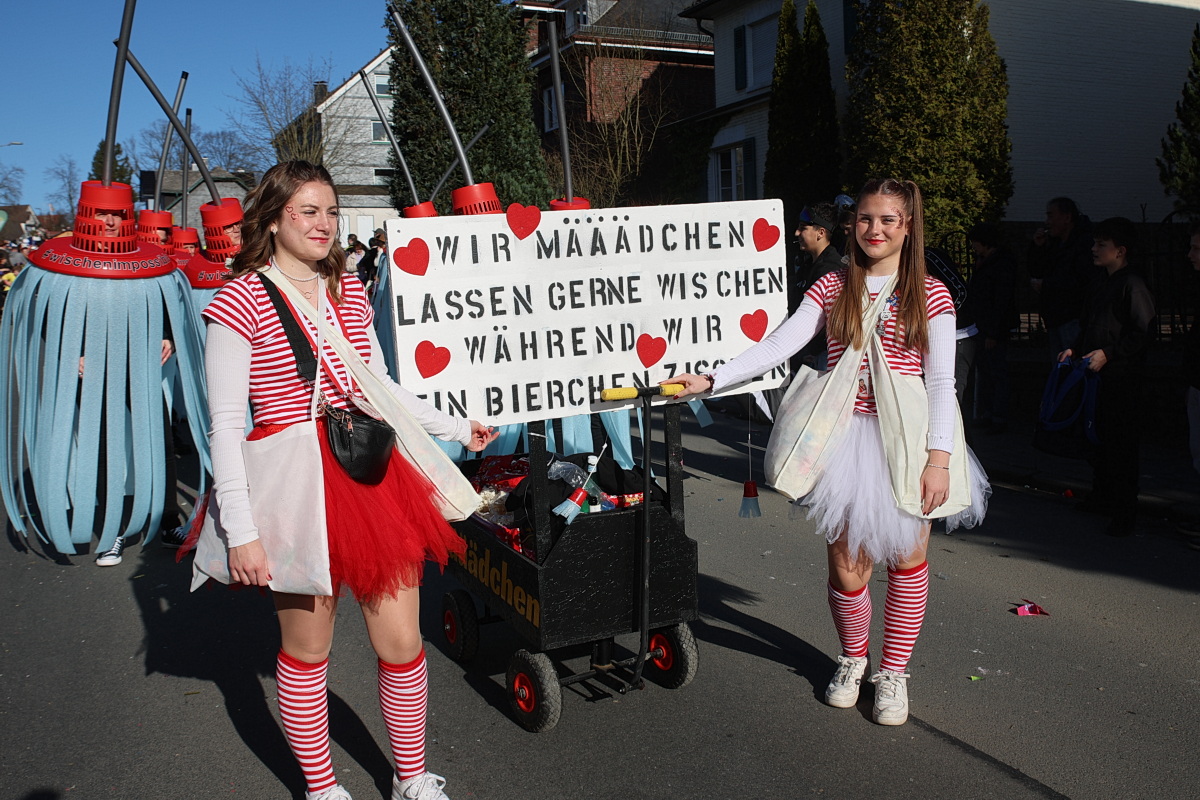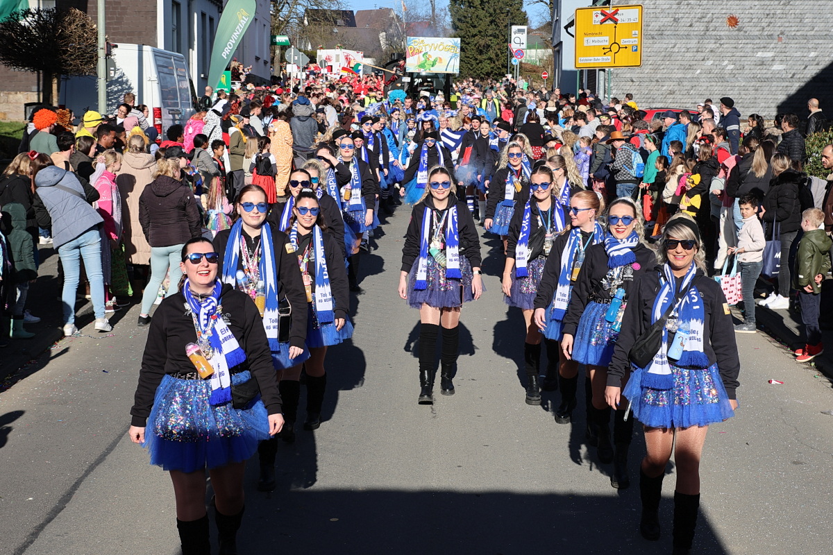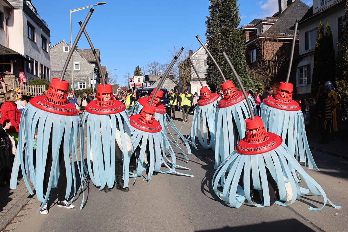 Richtig Remmidemmi machte die rollende Burg der Burggarde der KG Rot-Weiß Denklingen, das Motto auf dem Wagen der „Dörper Fründe“ outete deren Besatzung als Pazifisten „Waffen sind nicht unser Ding-wir regeln das im Ring“. Die riesige Abordnung der KG Morsbach, mit Prinz Partrick I. aus dem Hause Paffenholz, dem KG- Vorstand, der Kindergarde, der Garde Blau-Weiß und der Funkengarde grüßte mit dem dreifachen „Mueschbech deheem“, der Musikzug Holpe, unter Leitung von Noriko Sakano intonierte bekannte Karnevalsstimmungslieder. Einen tollen Blickfang lieferten die wirbelnden Wischmopps der „Schönenbacher Määääächen“, die versicherten „Wir Määääädchen lassen gerne wischen, während wir ein Bierchen zischen“.